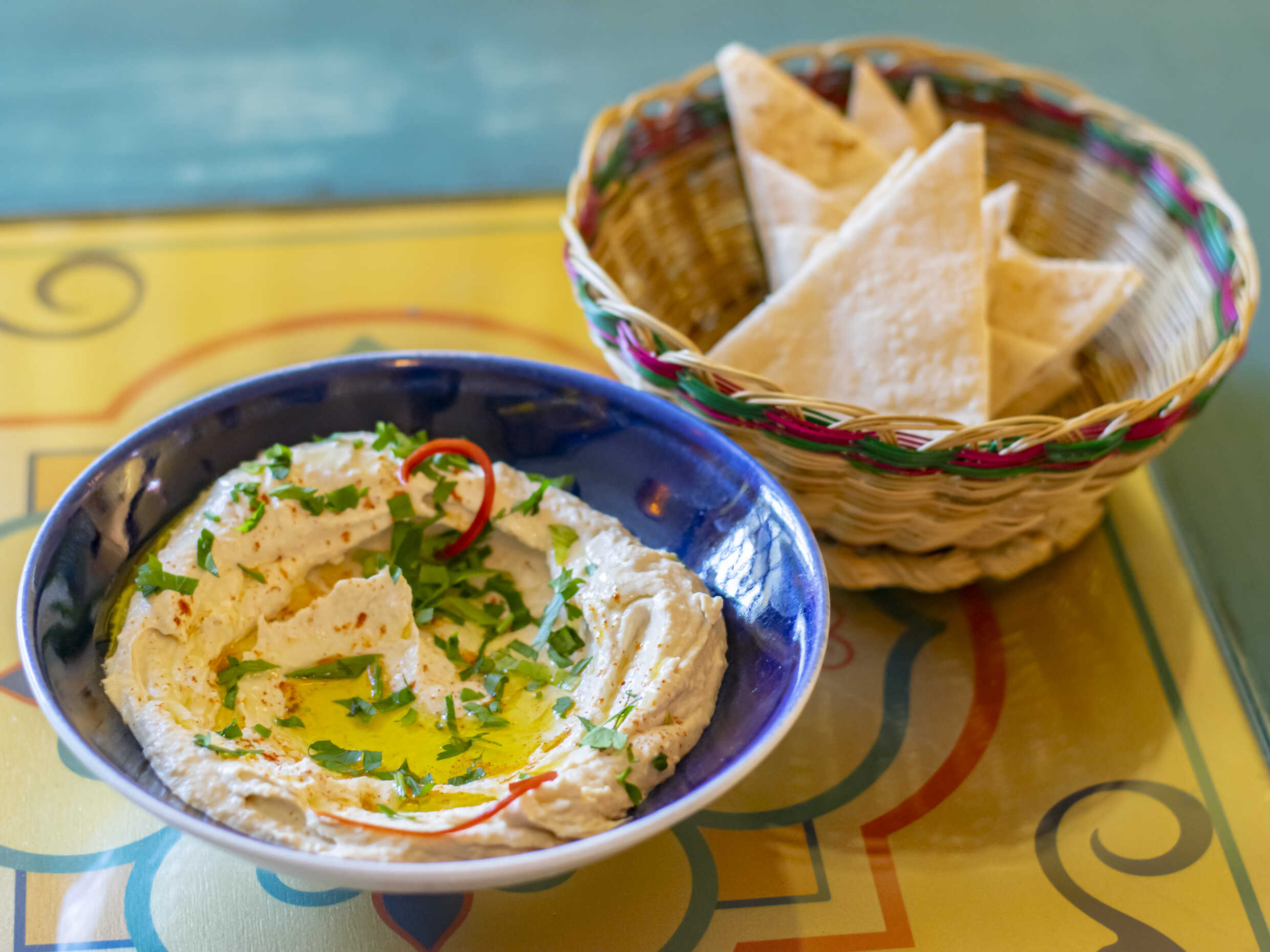 Puré de garbanzo con pasta de ajonjolí. Acompañado de pita.