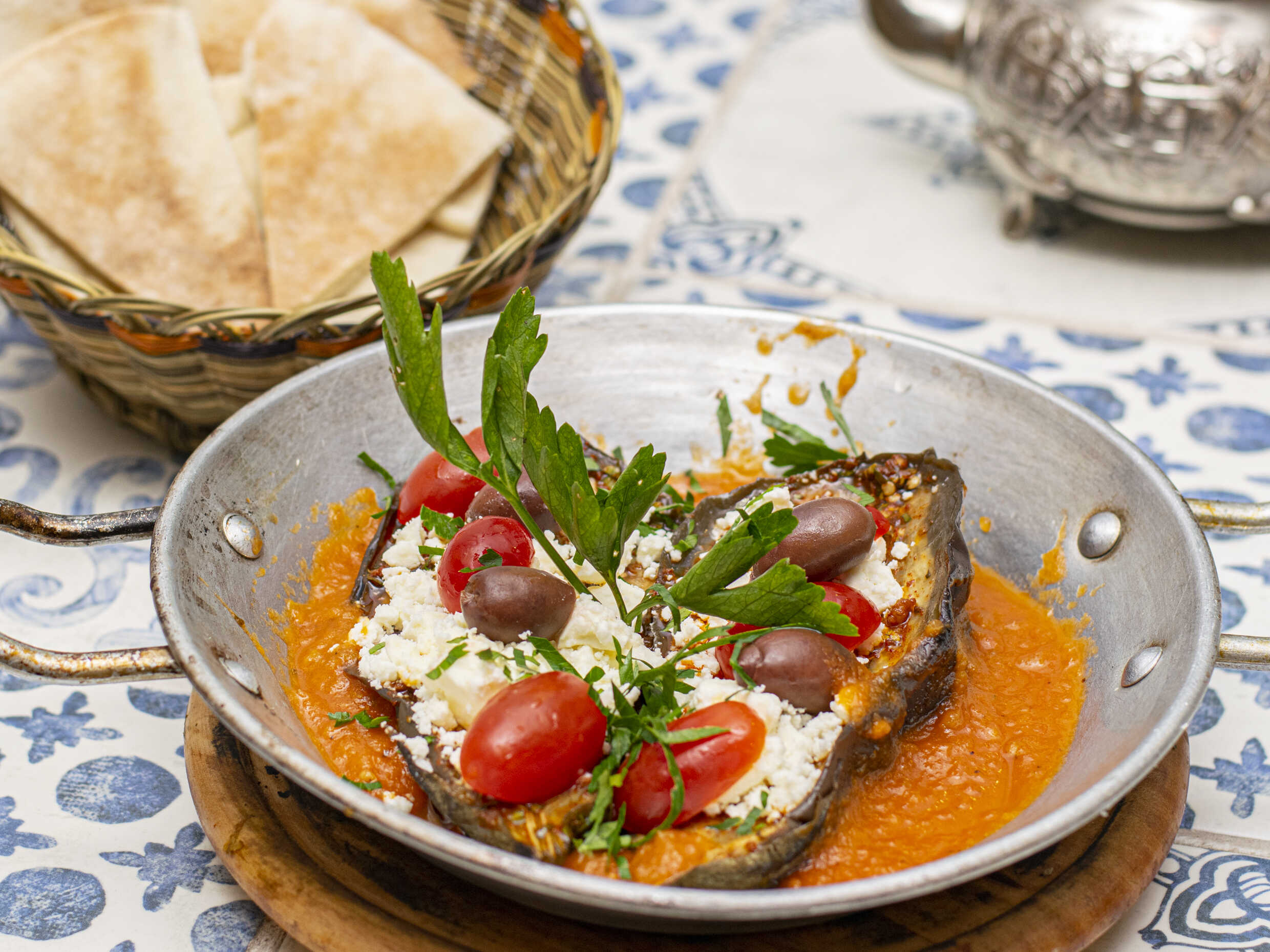 Berenjena entera al horno con queso feta, aceite de oliva y ajo. Acompañada de pita.