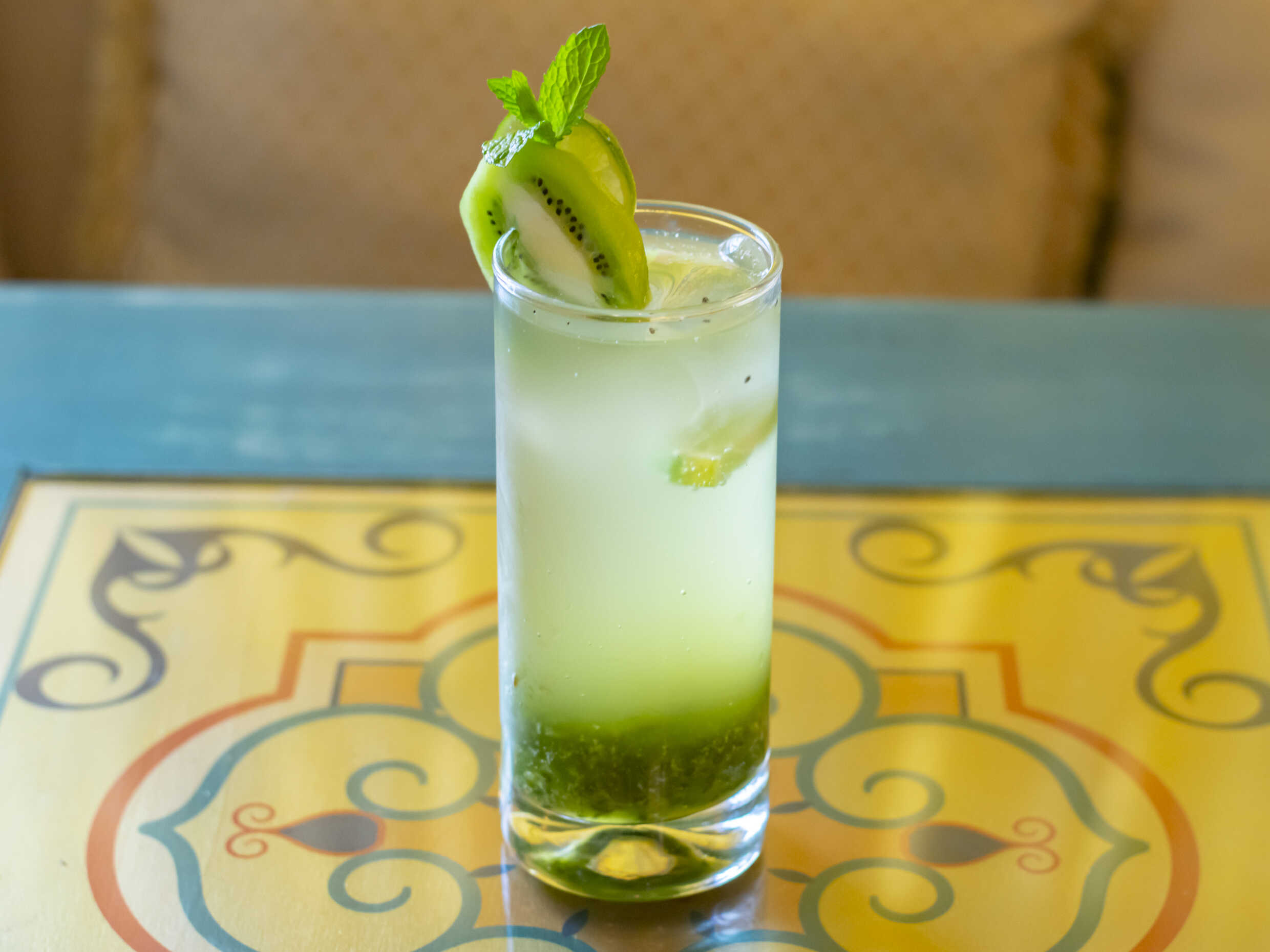 Zumo de limón, trozos de kiwi y hierbabuena en soda.