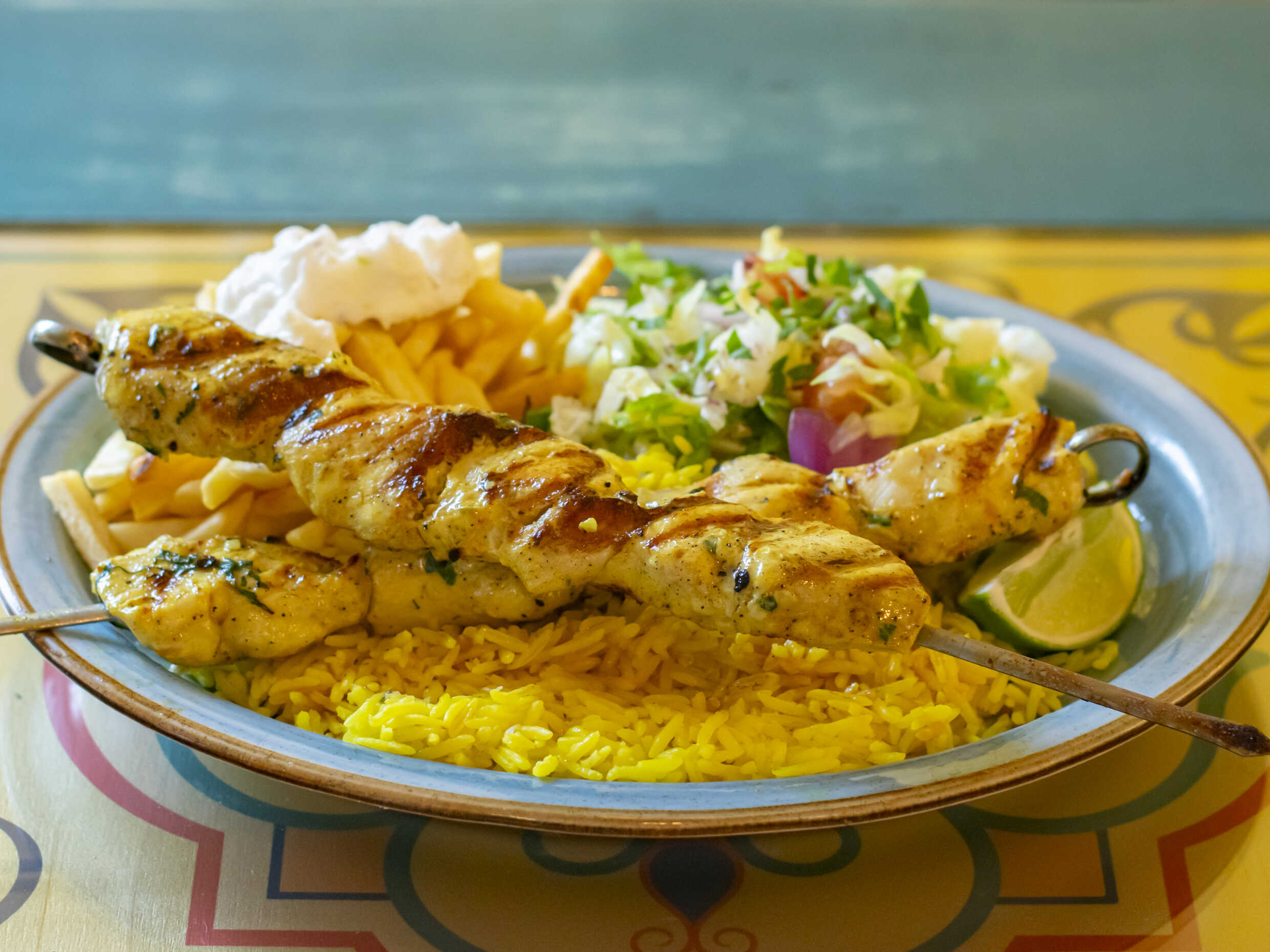 Brocheta de pollo a la parrilla. Acompañada de pita, patatas fritas, hummus y ensalada.