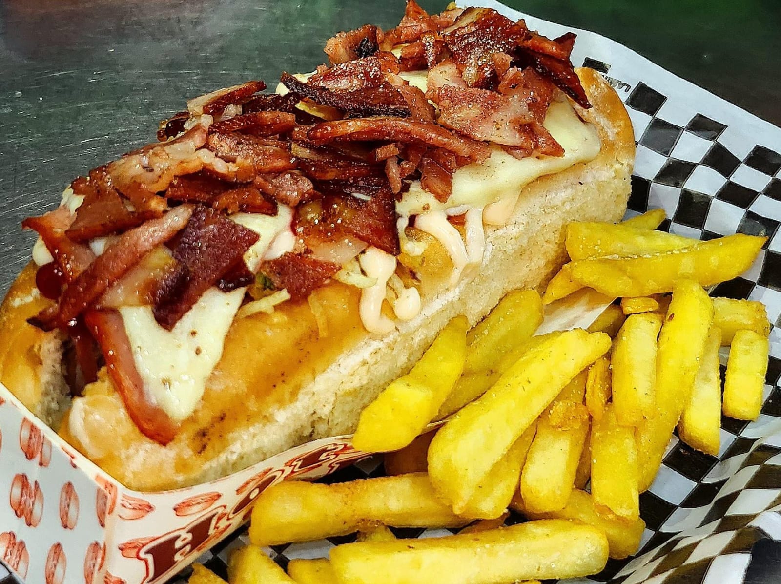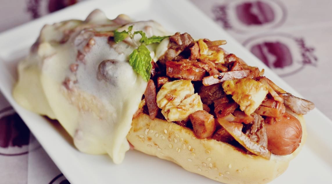 Salchicha americana, pan artesanal, cebolla caramelizada, papa chips, jamón, queso, tocineta, papa francesa, y salsas al gusto.