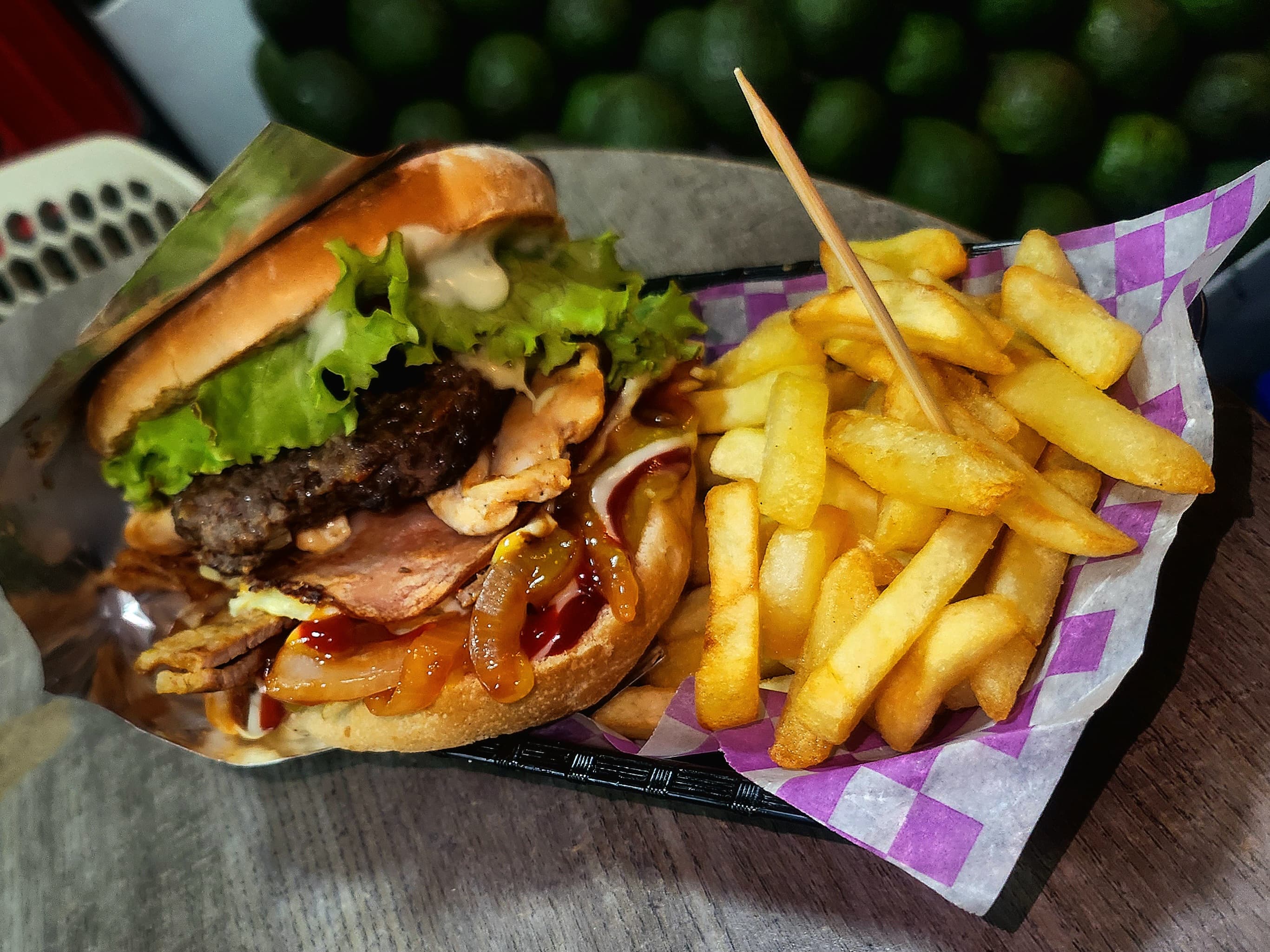 Porcion personal: Carne artesanal, pan artesanal, vegetales frescos, cebolla caramelizada, papa chips, pechuga de pollo, queso, jamón, tocineta, y salsas al gusto.
