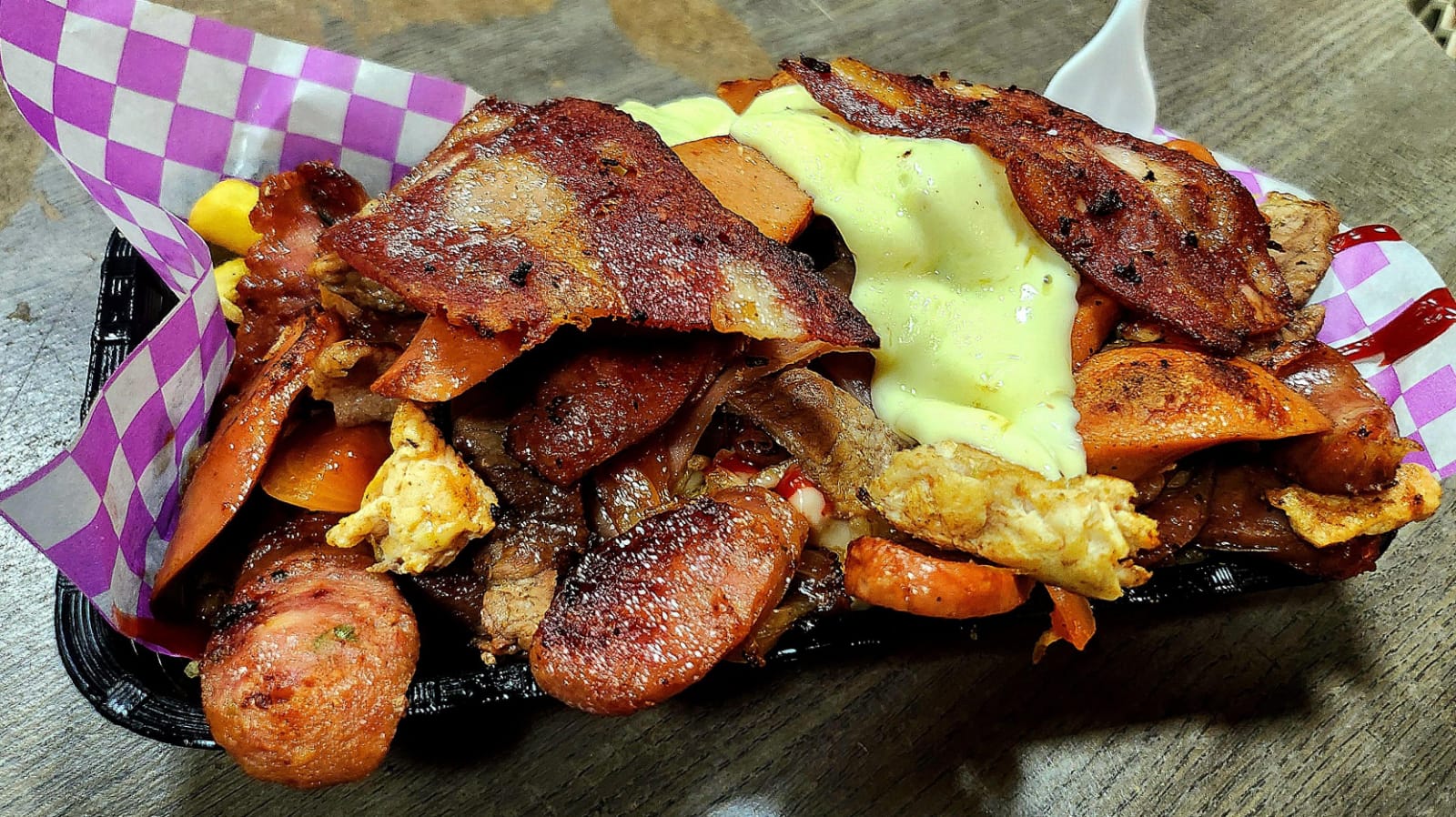 Chorizo santarrozano, papa francesa, papa chips, cebolla caramelizada, queso, tocineta, y salsas al gusto.