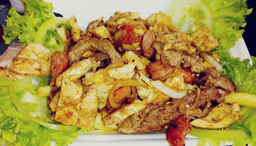 Carne de res, pechuga de pollo, chorizo santarrozano, acompañada de cebolla salteada, vegetales frescos, y salsas al gusto.