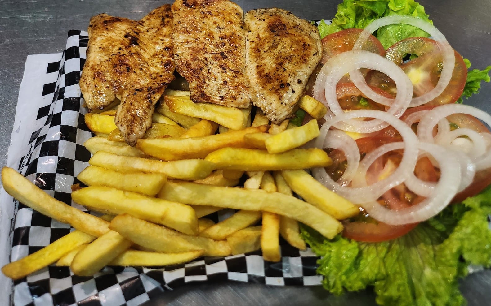 Pechuga de pollo, papa francesa, ensalada, y salsas al gusto