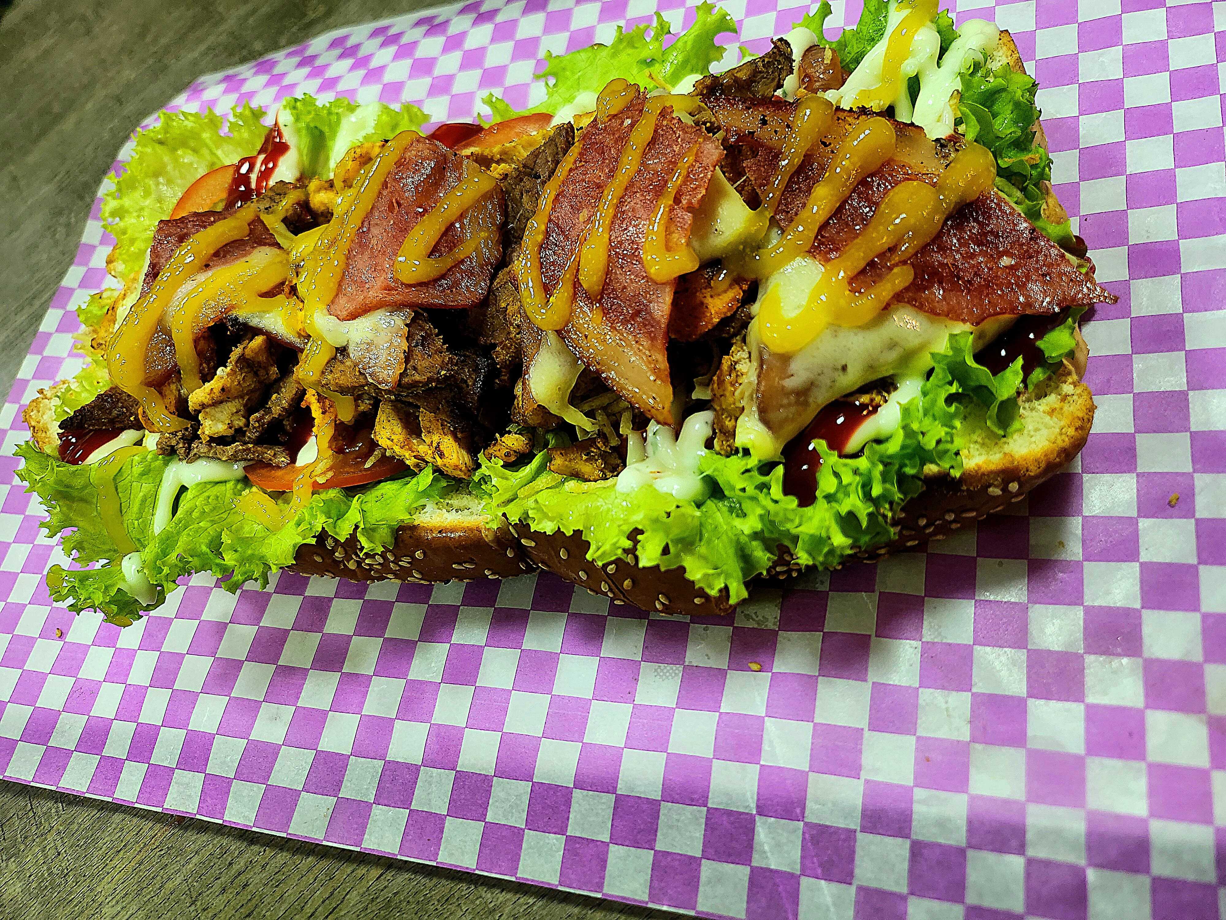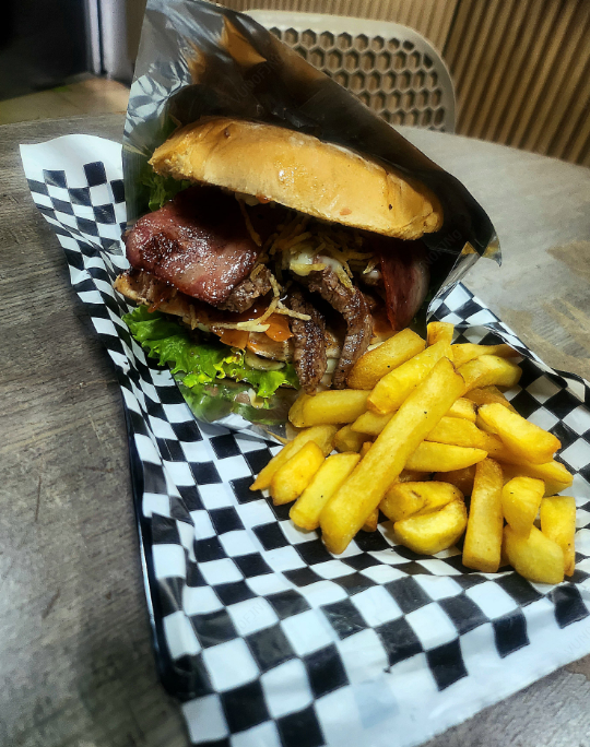 Pan artesanal, carne artesanal (res) y pechuga de pollo, vegetales frescos, cebolla caramelizada, maíz tierno, papa chips, papa francesa, jamón, queso doble crema, tocineta y salsa al gusto.