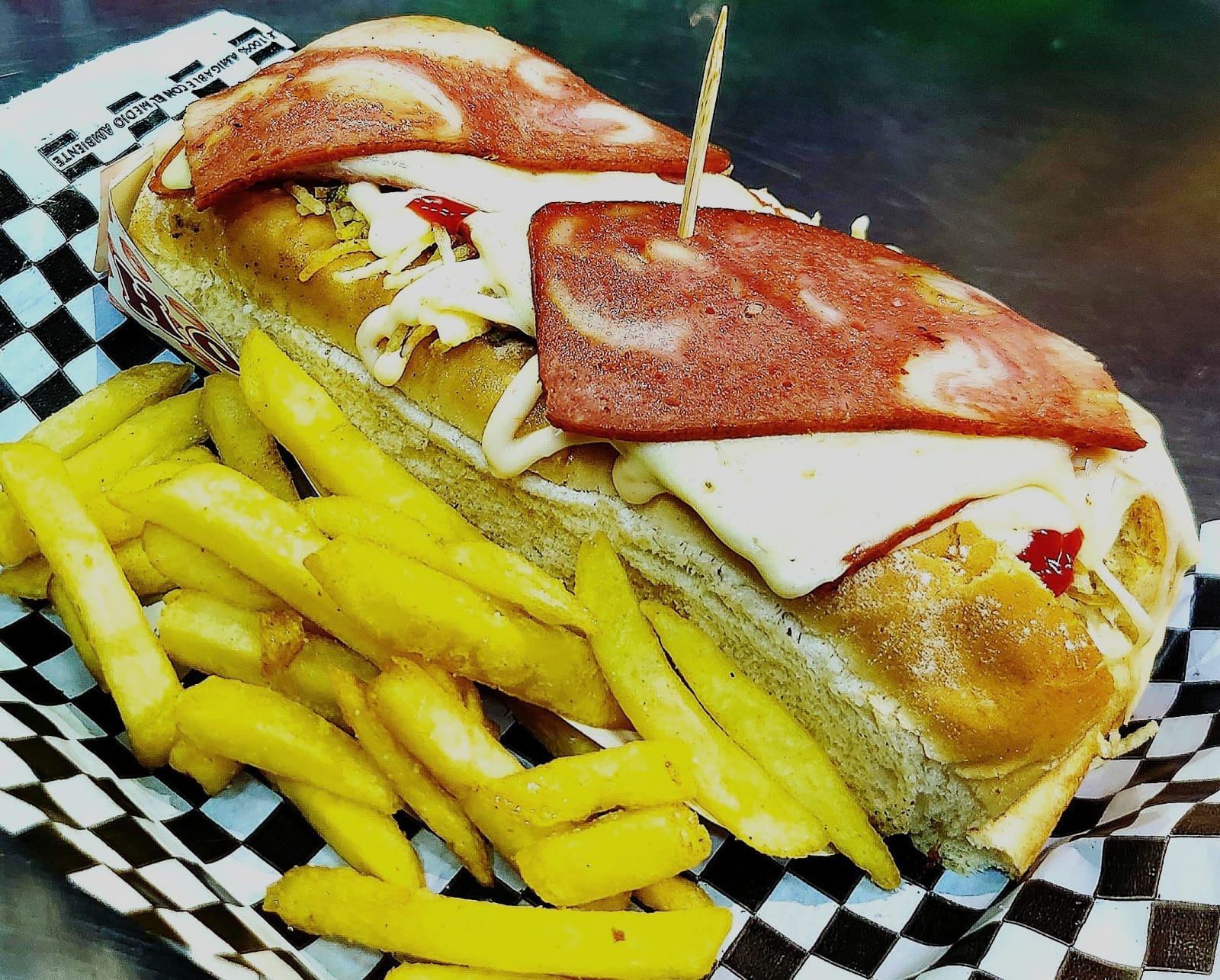 Salchicha americana, papa chips, papa francesa, queso, jamón, tocineta, y salsas al gusto.