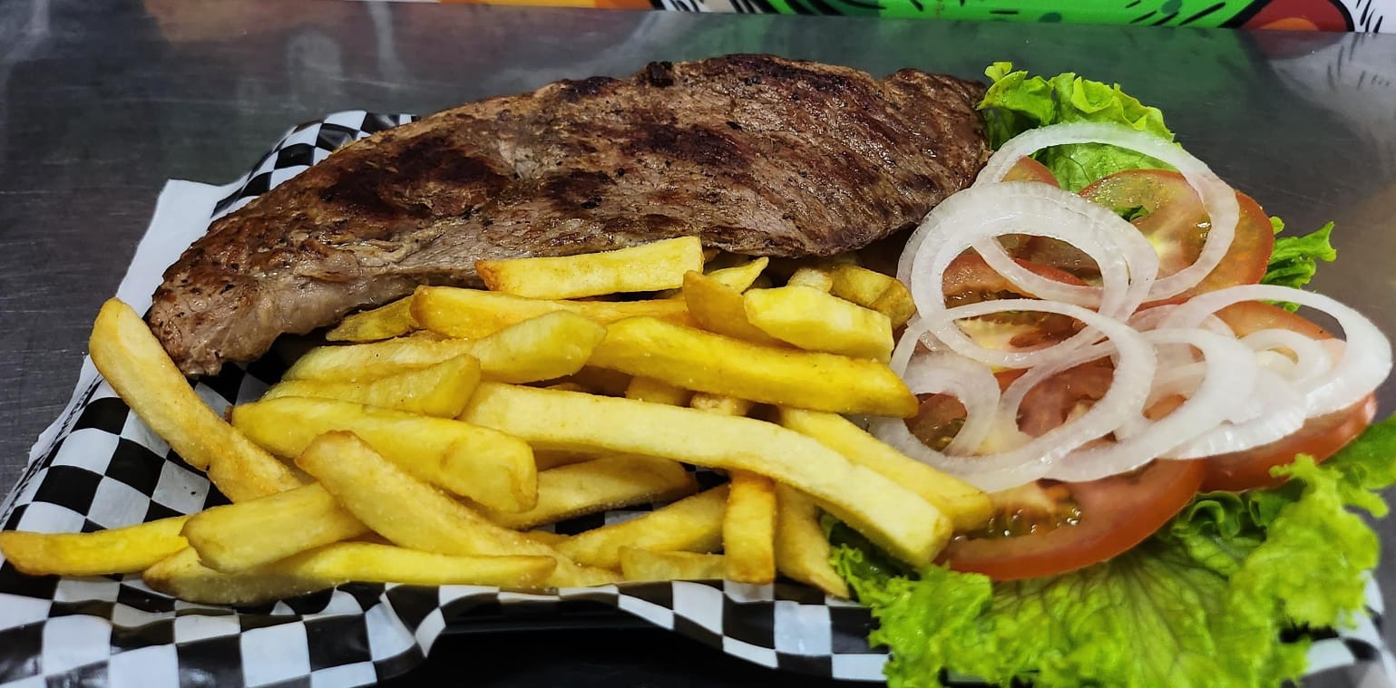 Carne de res, papa francesa, ensalada, y salsa al gusto.