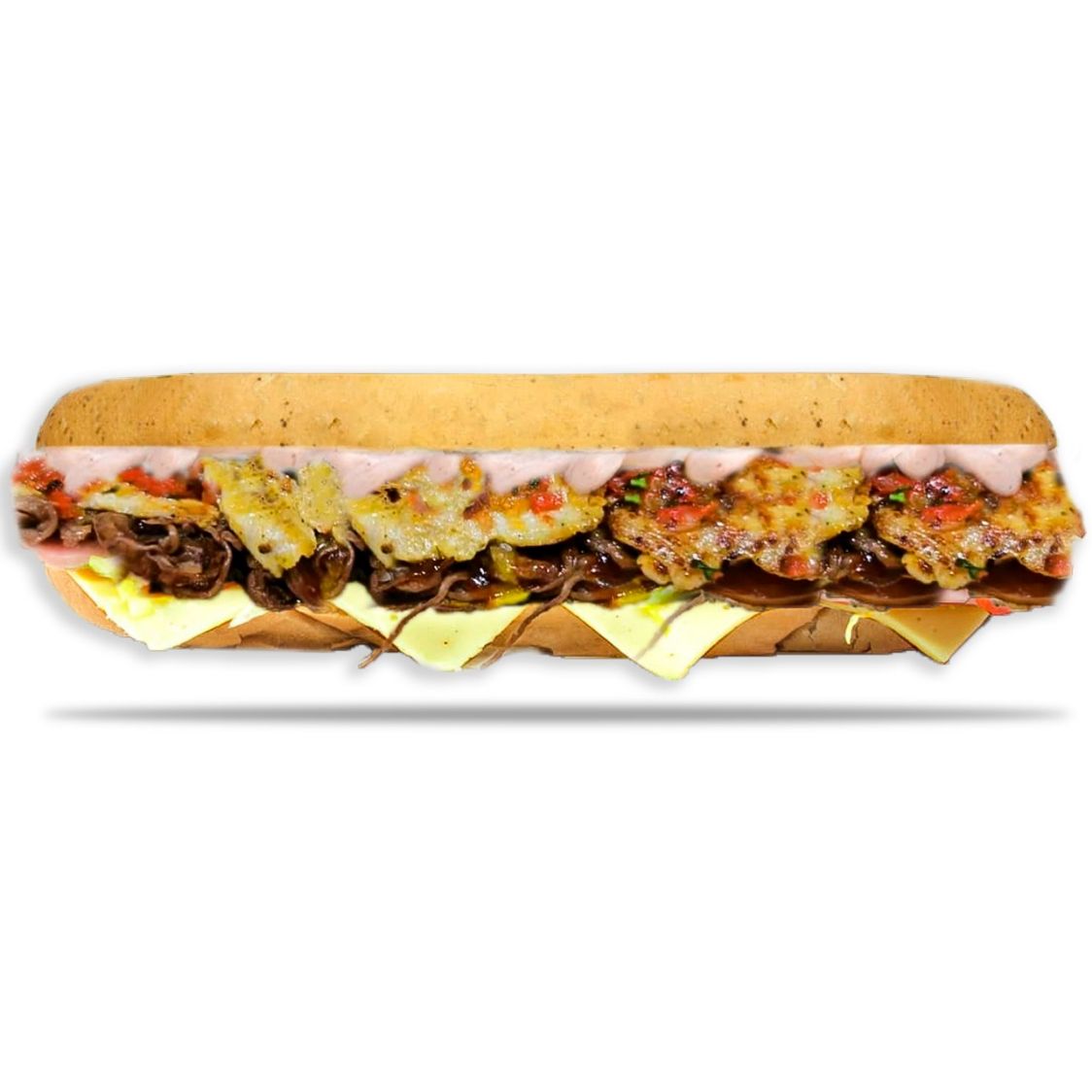 Jamón, salami, pepperoni, lechuga, tomate, queso mozzarella, pimienta, salsa de ajo.