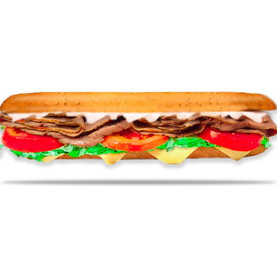 Pollo roast beef ahumado, lechuga, queso mozzarella, salsa de ajo y salsa de queso cheddar.