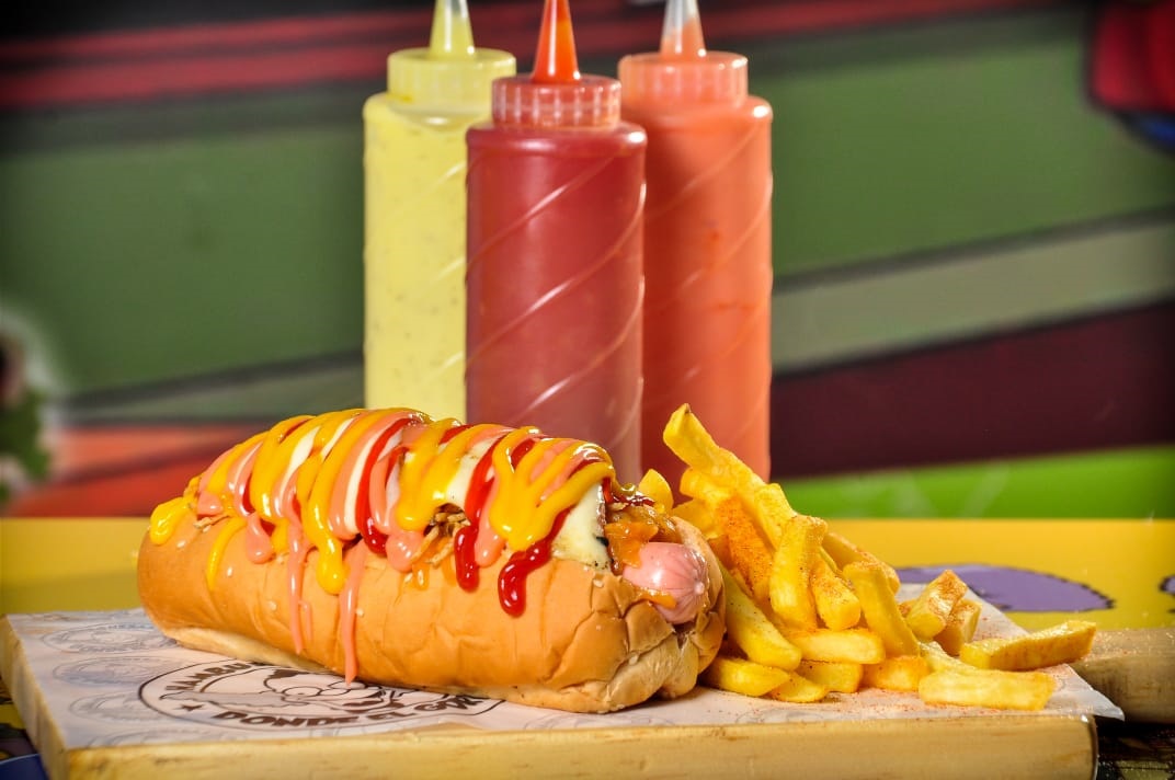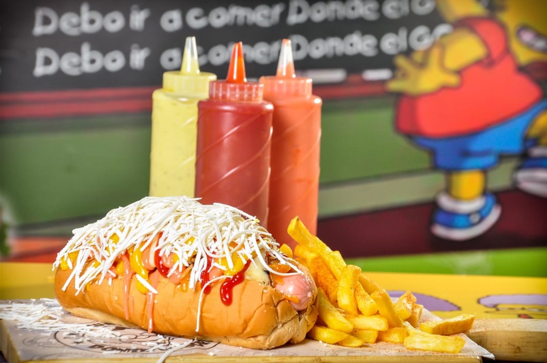 Salchicha americana suizo, triple queso, doble crema, papa chip, pollo desmechado, cebolla doble tocineta, champiñón y 2 huevos de codorniz.