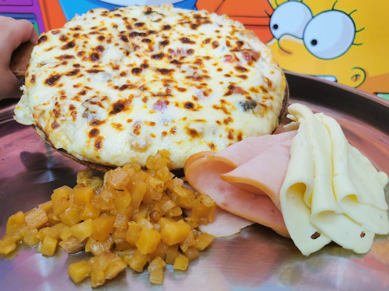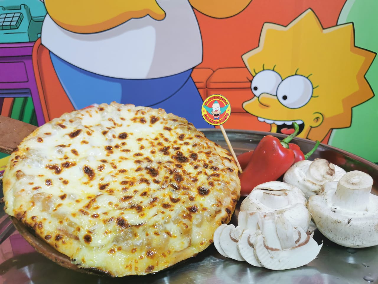 Tocineta, jamón, salami, cabano, carne molida, champiñón, pollo, pico de gallo, maíz, salsa BBQ, orégano y queso.