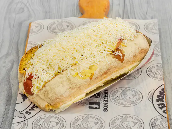 Salchicha americana, suizo queso doble crema, queso rayado, jamón, cebolla, papa chips y salsas.