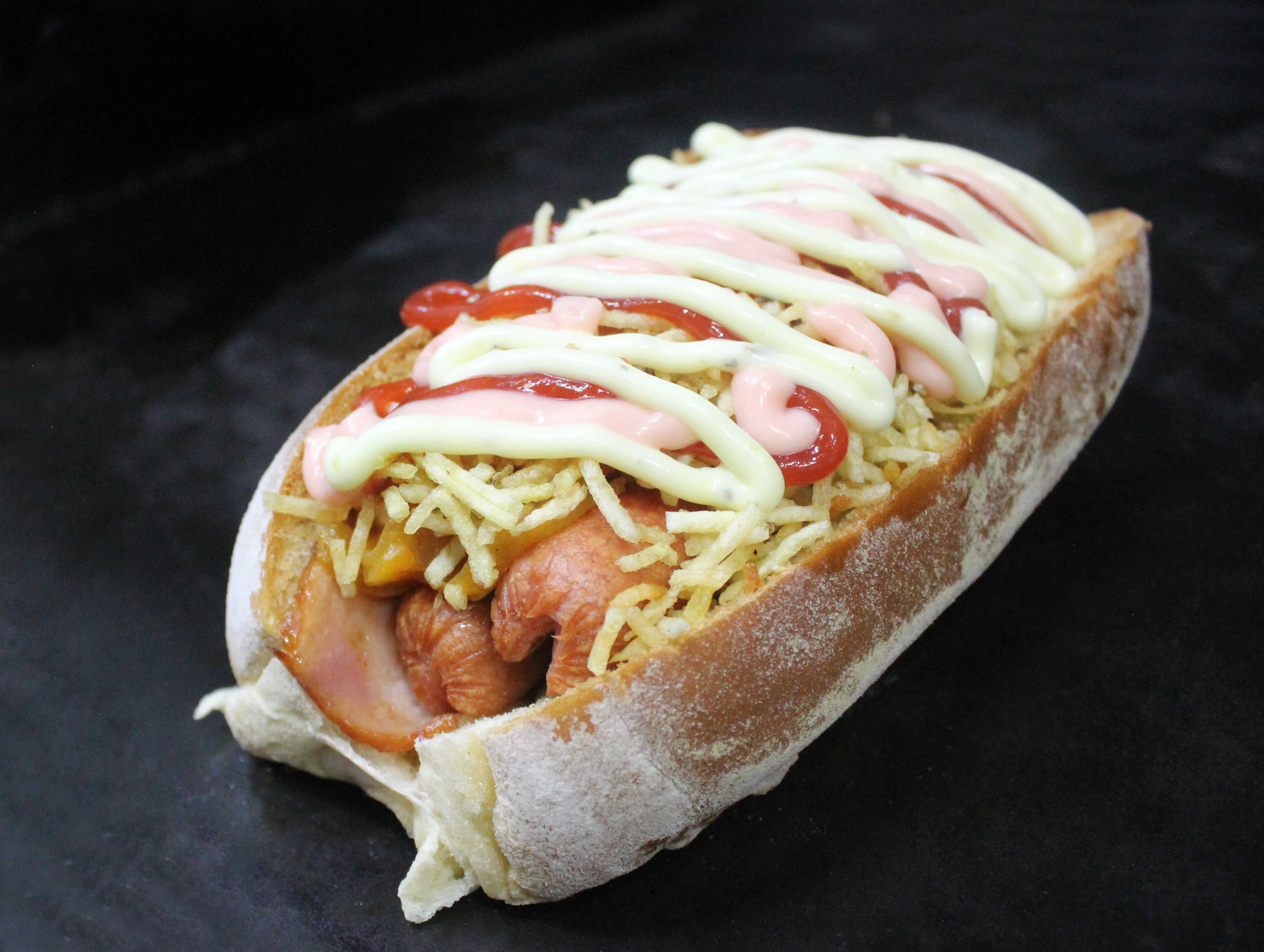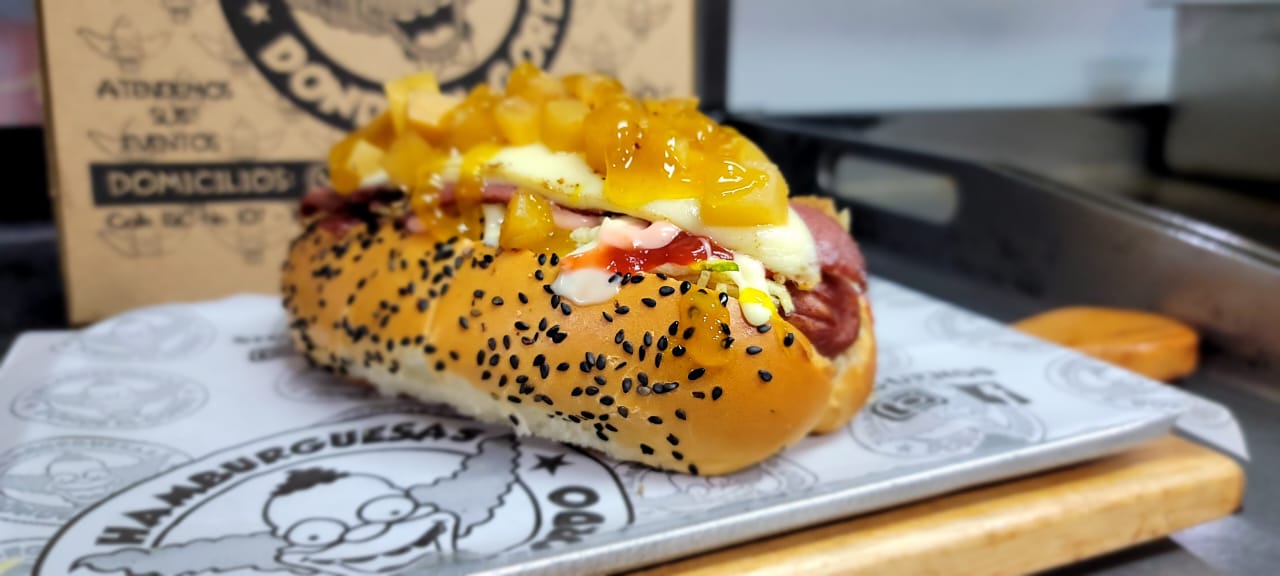 Pan artesanal Salchicha americana Queso doble crema Jamón Piña en trozos Papa cabello ángel Salsas