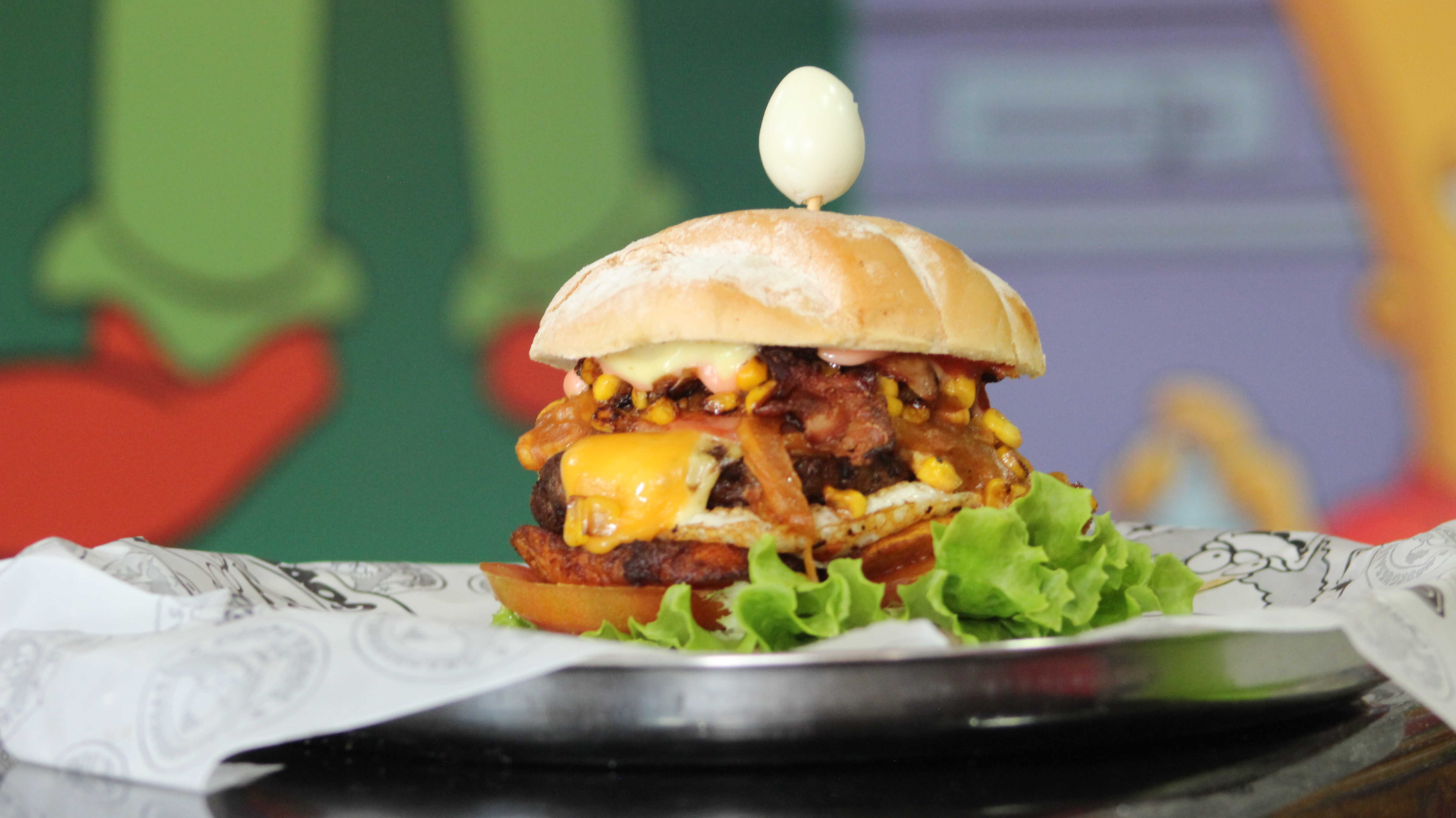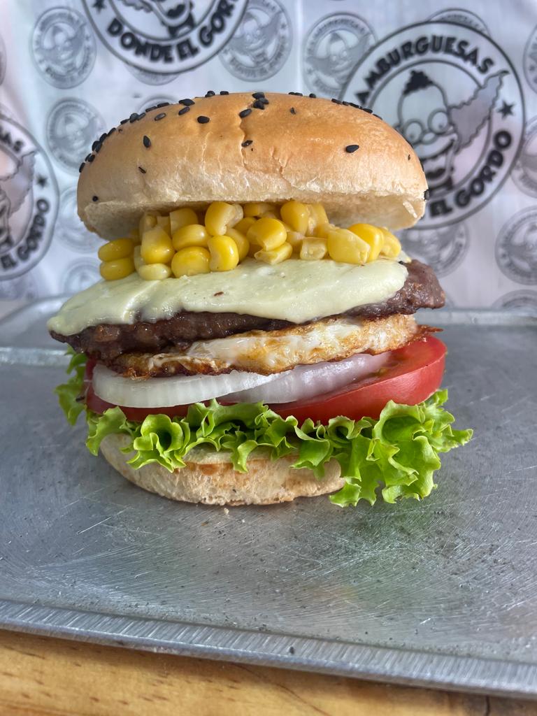 Carne, queso doble crema, tomate, cebolla, lechuga, salsas, pan brioche, huevo frito, maíz tierno.