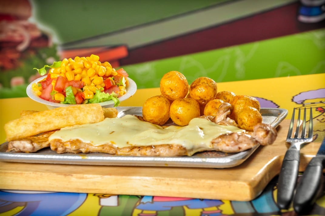 250 gramos de pechuga gratinada, papas a la francesa o papa criolla, yuca o ensalada.