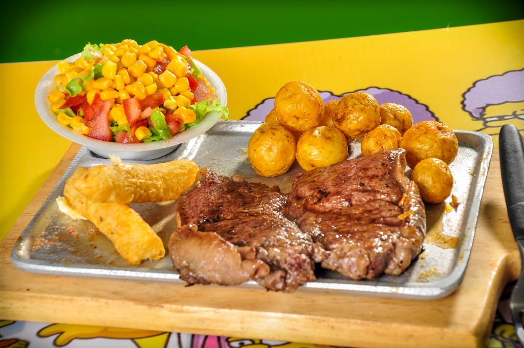 250 gramos de carne, papas a la francesa o papa criolla, yuca o ensalada.