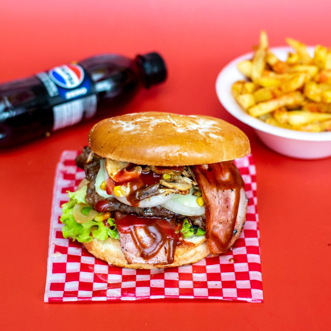 Hamburguesa con pan artesanal. 3 carnes de res, 3 quesos, mazorca, tocineta, papa chips, cebolla, lechuga, salsas de la casa.