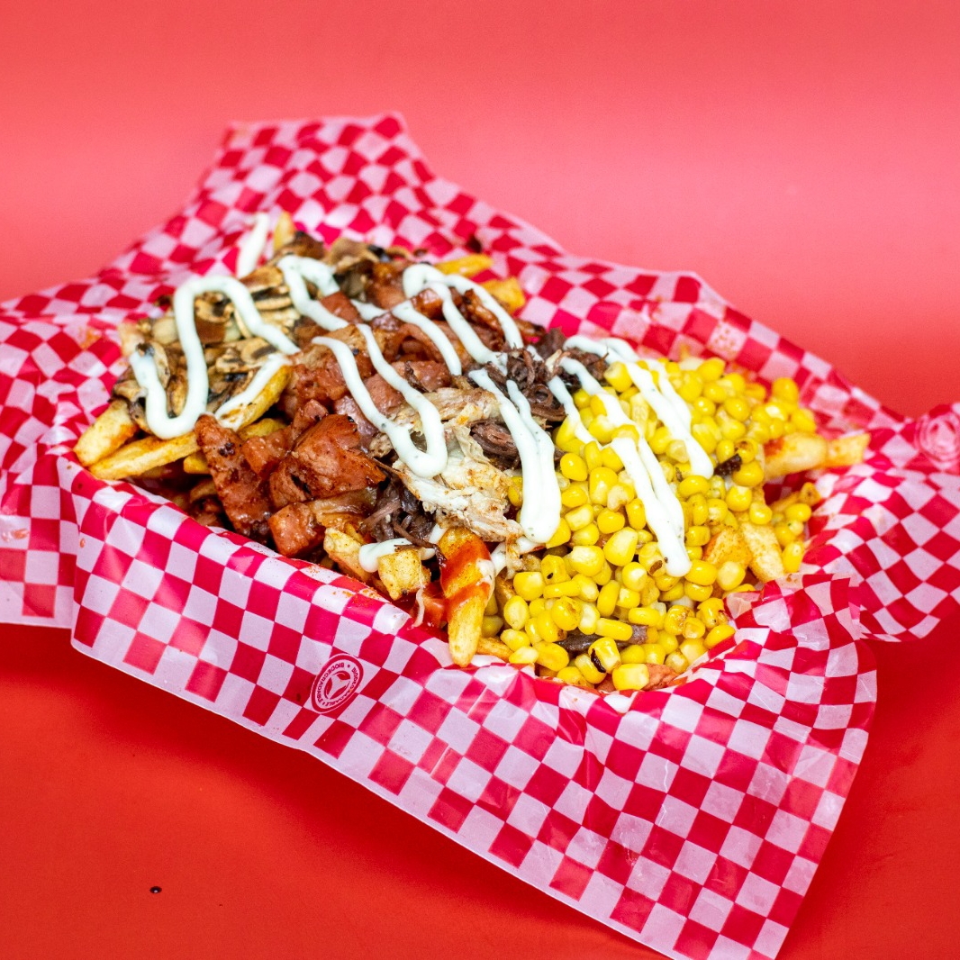 Platillo para 2 personas aprox. Salchipapa con , salchicha americana, papas a la francesa,(aprox 125 g), mazorca, queso gratinado, carne, pollo desmechado, tocineta y salsas de la casa.