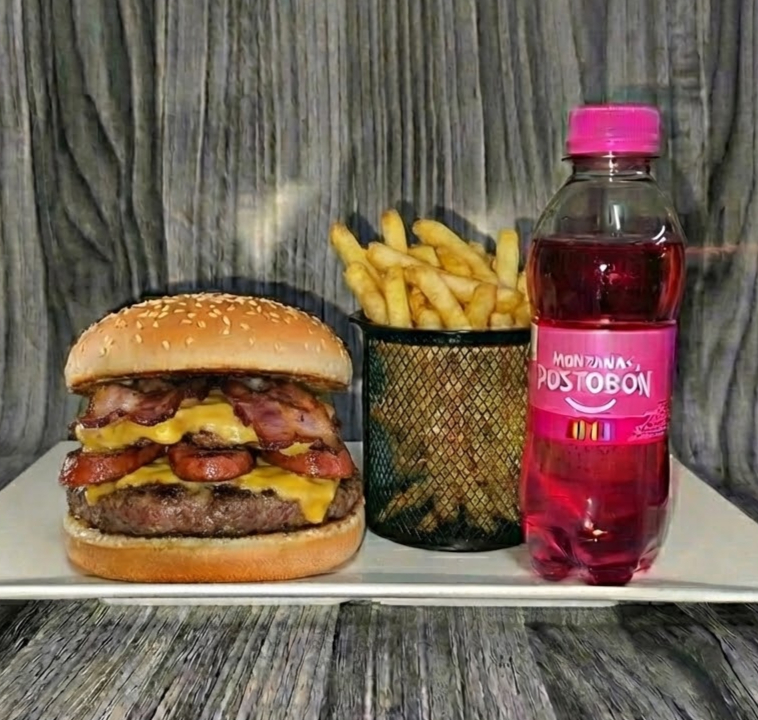 ¡Hambre real? Disfruta de 240g de jugosa proteína artesanal, gratinada con queso fundido y tocineta ahumada. El toque único: papas chips crujientes y nuestro trío de salsas (BBQ, tomate y secreta de la casa). Acompañada de 100g de papas a la francesa doraditas y 1 gaseosa helada.