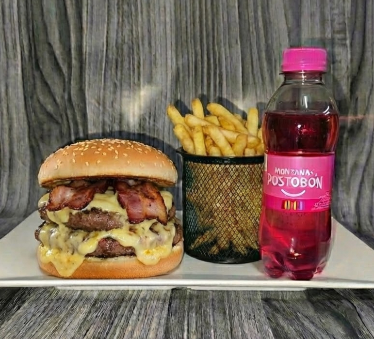 Combo Doble Burger (240g) + Papas Una torre de sabor: 2 medallones de carne (240g total) asados al punto, intercalados con queso fundido y tocineta crocante. Coronada con papa chips para un crunch extra y bañada en salsa BBQ, tomate y nuestra receta de la Casa. Incluye: 100g de papas francesas + Gaseosa
