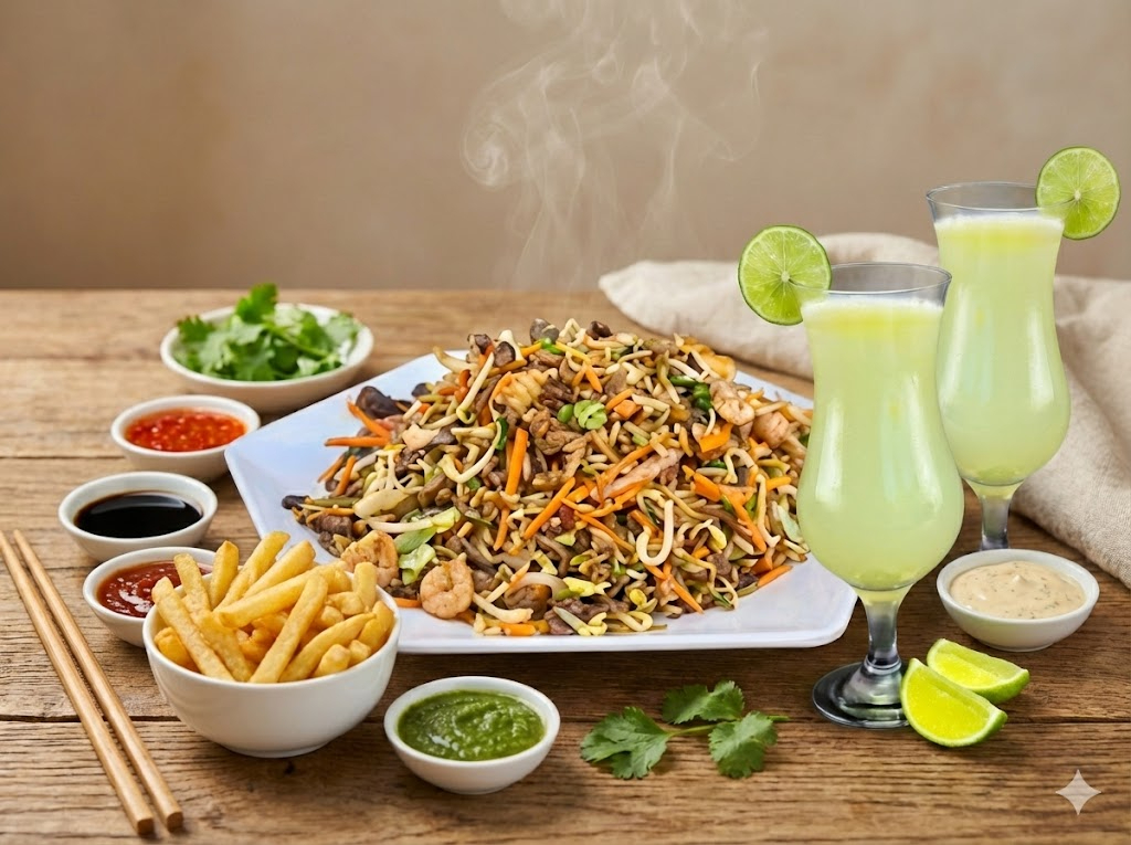 1250gr. Arroz Salteado Al Wok, Acompañado con trocitos de Pollo, Carne, Jamon, vegetales, Habichuela, Raiz China Y Zanahoria y 3 Bebida de la casa