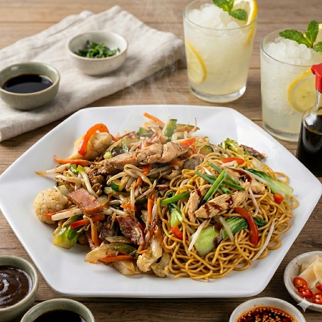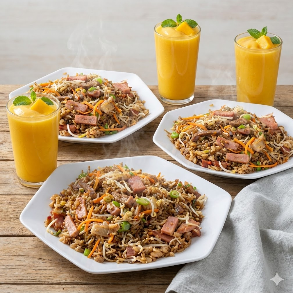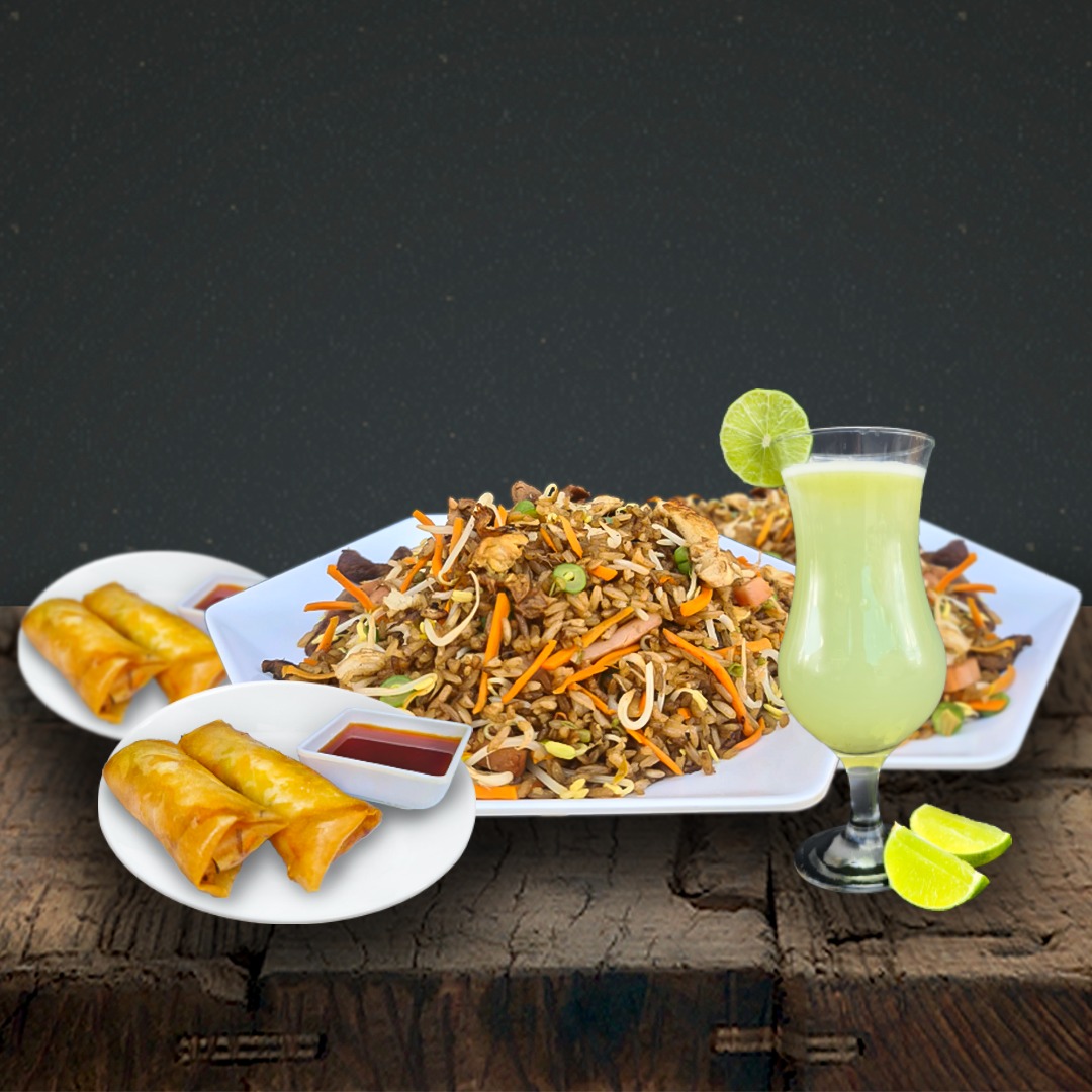 1250gr. Arroz Salteado Al Wok ,Acompañado con trocitos de Pollo, Carne, Jamon, vegetales, Habichuela, Raiz China y zanahoria, 4 Lumpias y 4 bebidas de la casa.
