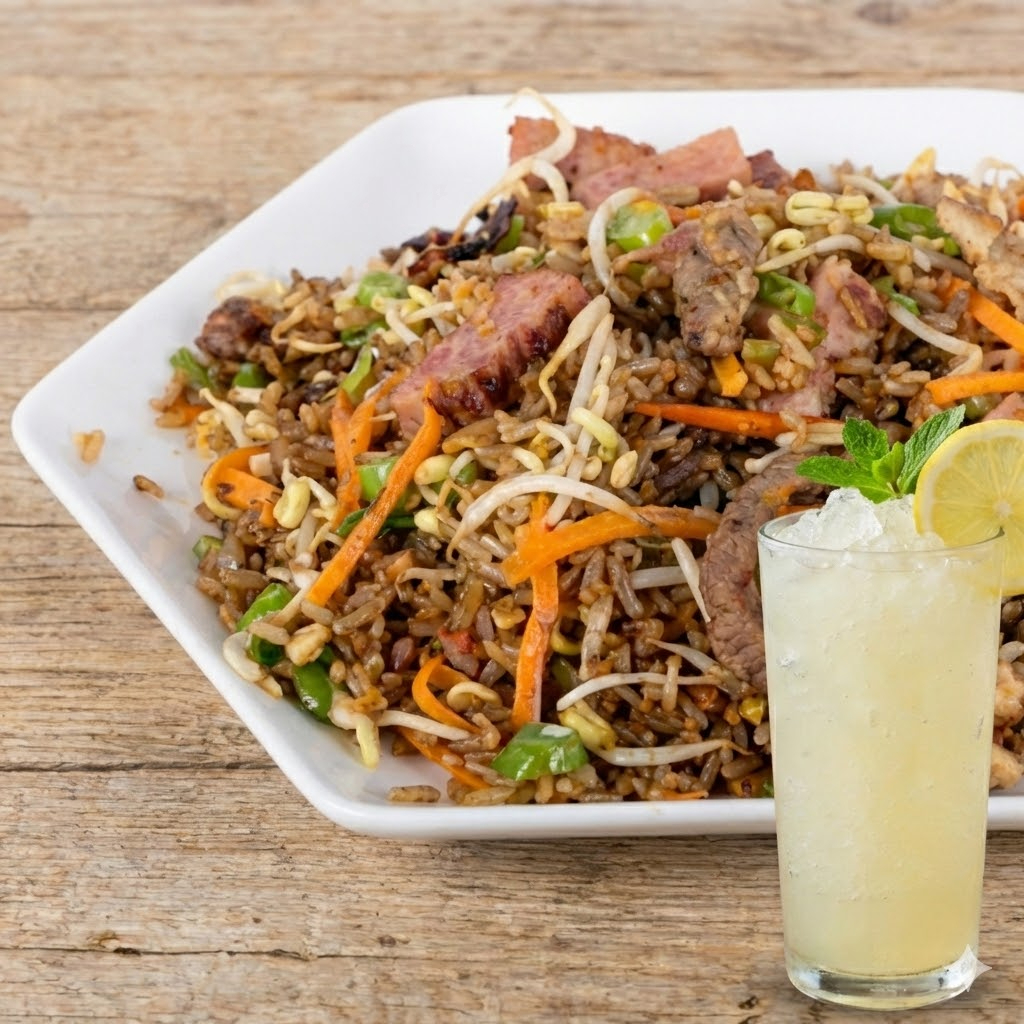 850gr Arroz Salteado Al Wok ,Acompañado con trozitos de Pollo,Carne,Jamon, vegetales, Habichuela, Raiz China y zanahoria + 2 Limonada de la casa