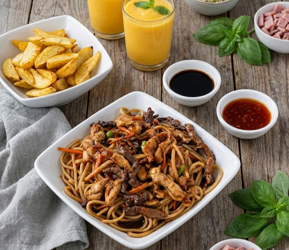 Trozos de Carne,jamon,Pollo salteados al wok con vegetales,salsa aoparte teriyaki o agridulce, unas papas en casco y 2 bebidas de la casa.