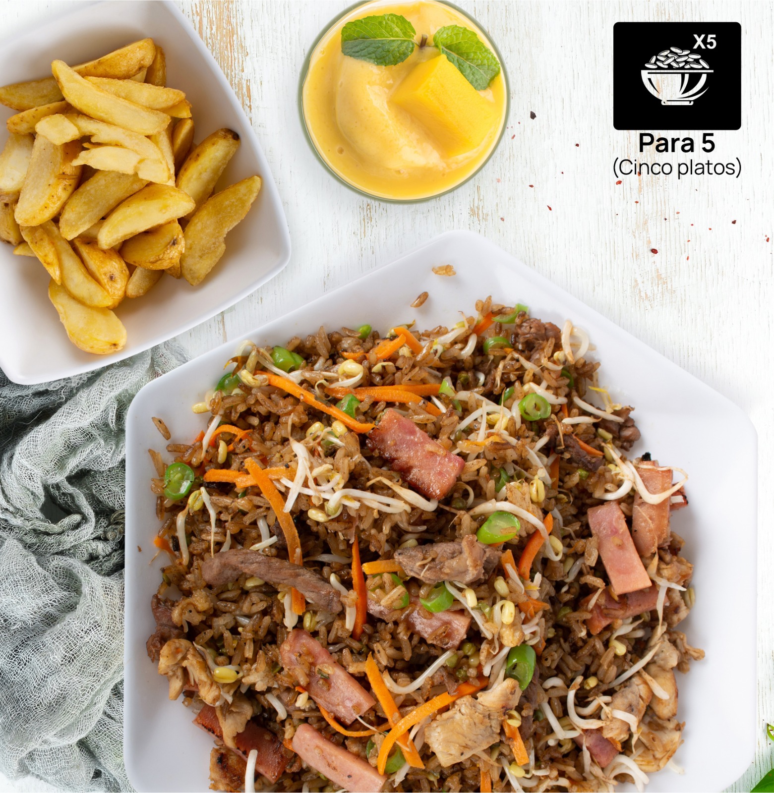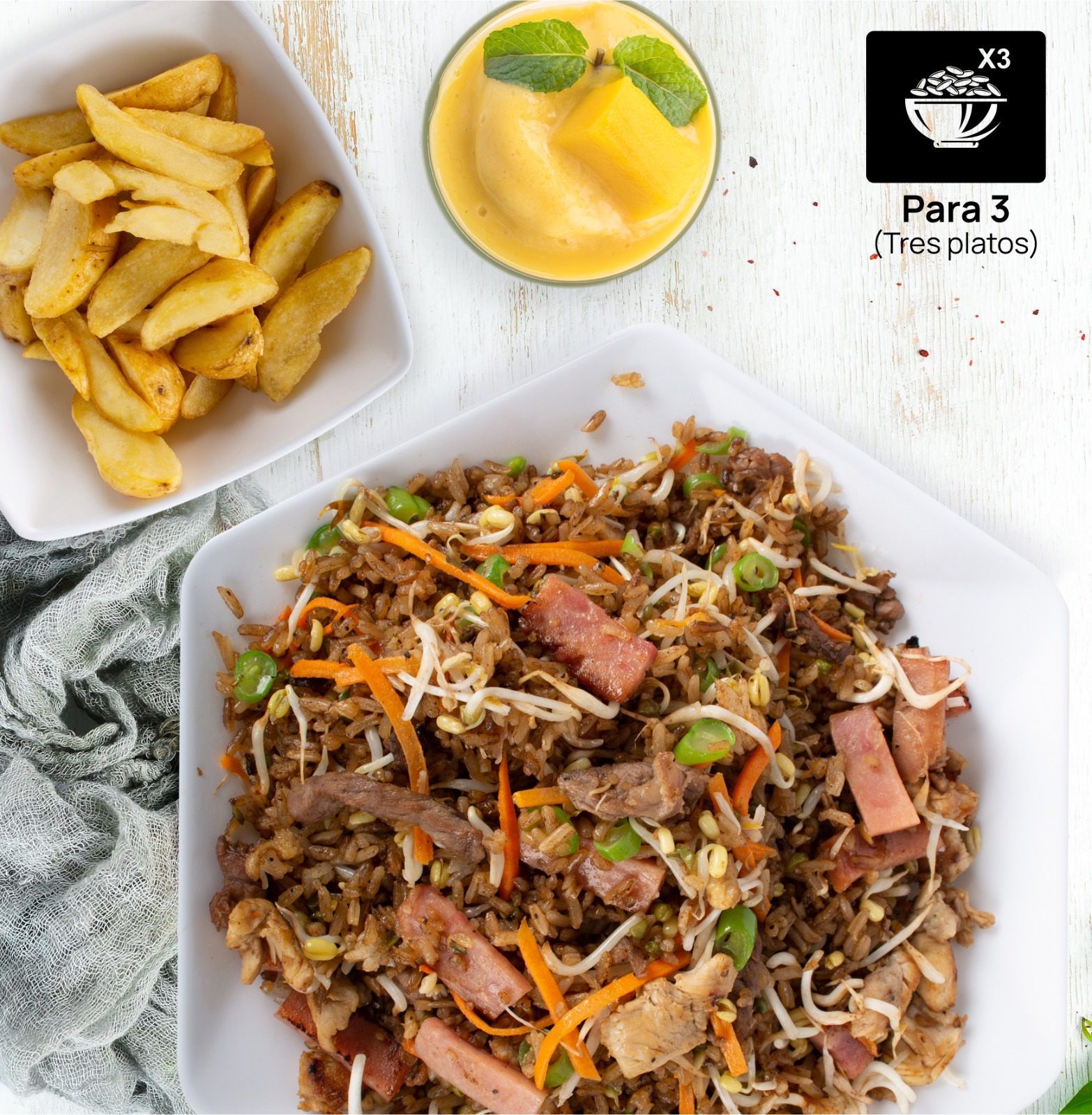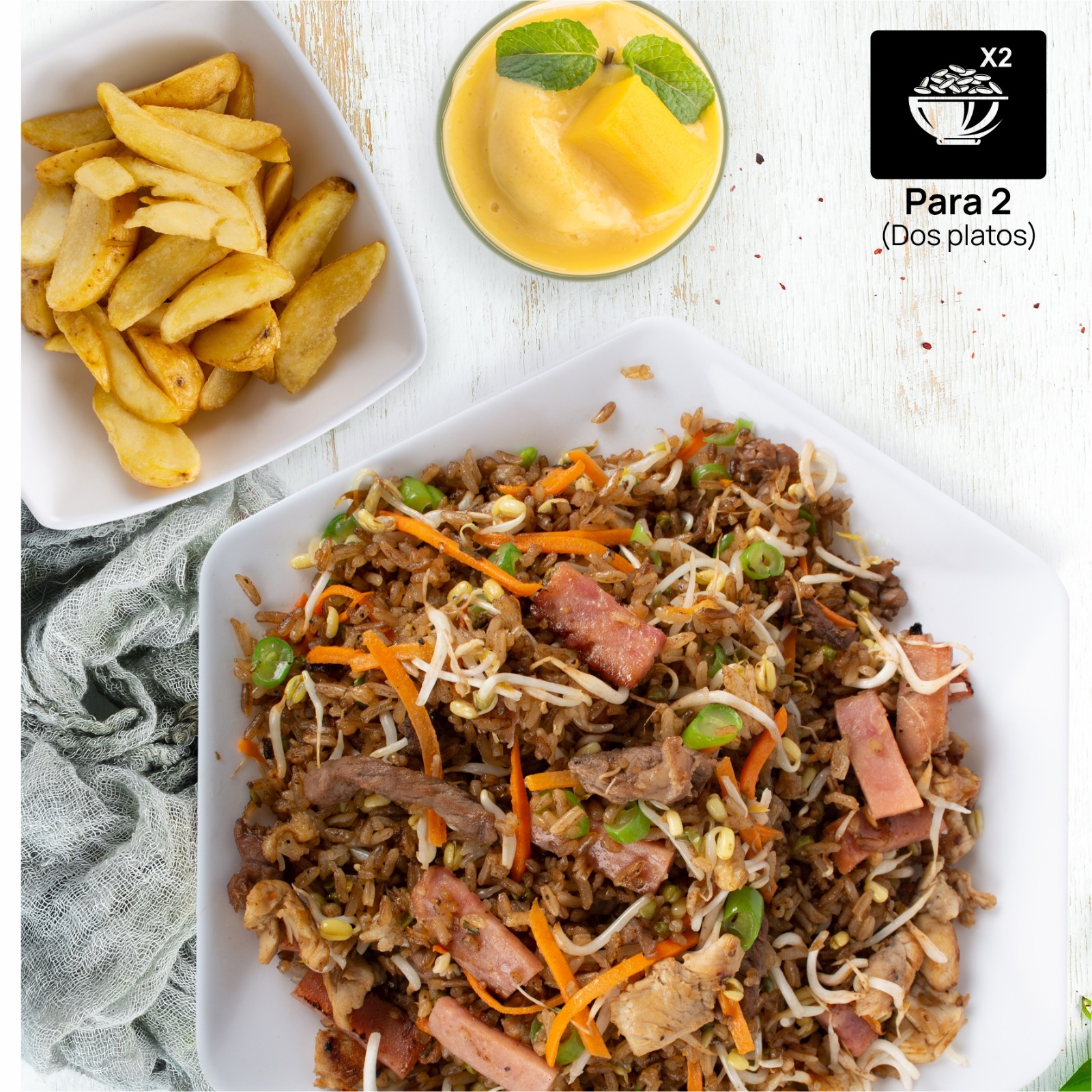 1200 g de arroz salteado al wok, acompañado con trocitos de pollo, carne, jamón, vegetales, habichuela, raíz china y zanahoria + 3 porciones de papas (cascos o a la francesa) + gaseosa de 1.5 L.