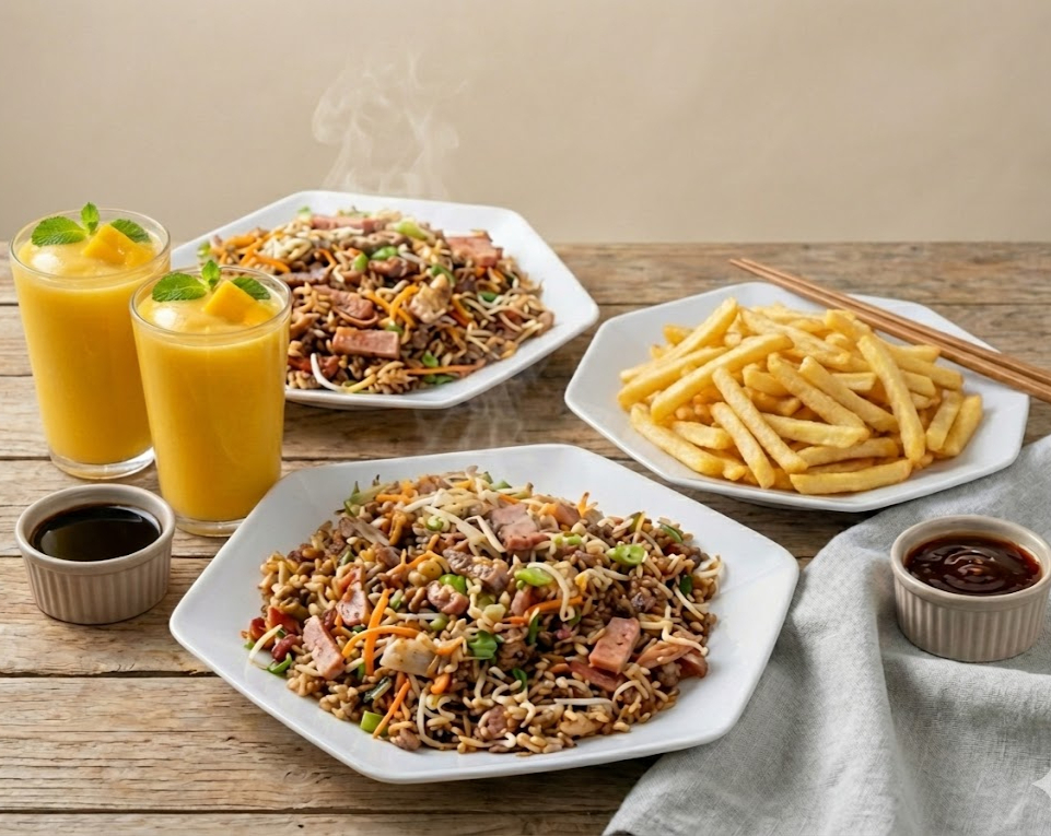 1200 g de arroz salteado al wok con trocitos de pollo, carne, jamón, habichuela, raíz china y zanahoria + 3 porciones de papas (cascos o a la francesa) + gaseosa de 1.5 L.
