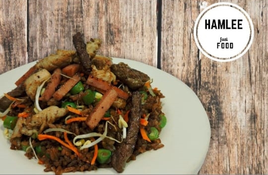 Arroz salteado al wok ,acompañado con trocitos de pollo, carne, jamón, vegetales, habichuela, raíz china y zanahoria, papas a elección mas bebidas.