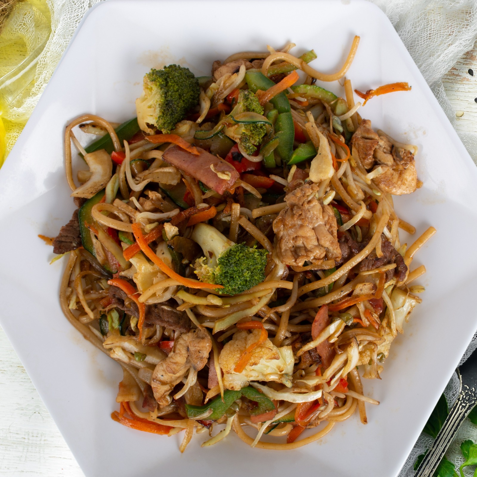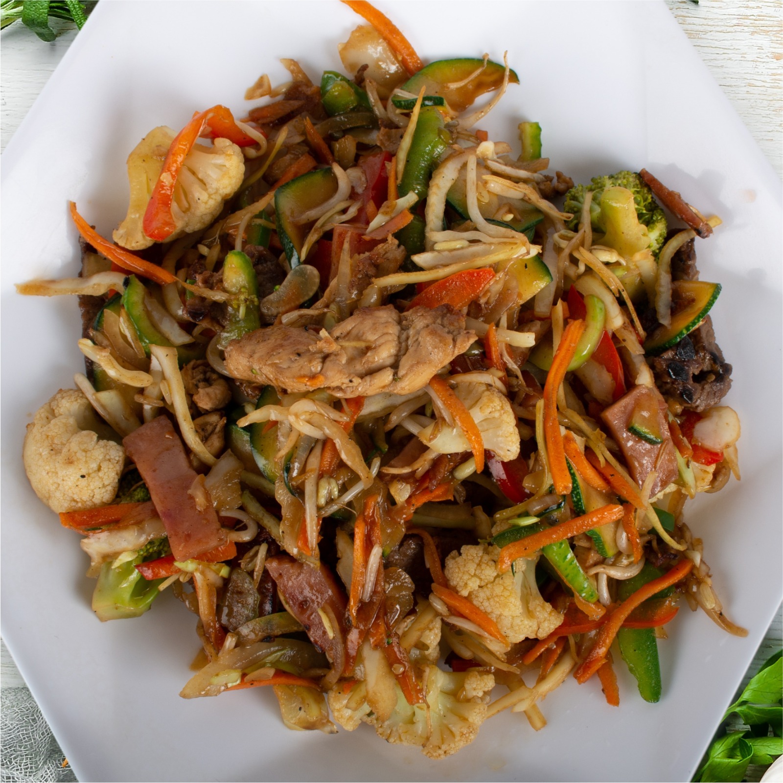 Vegetales saltiados al Wok, trocitos de Carne, Pollo y Jamón.