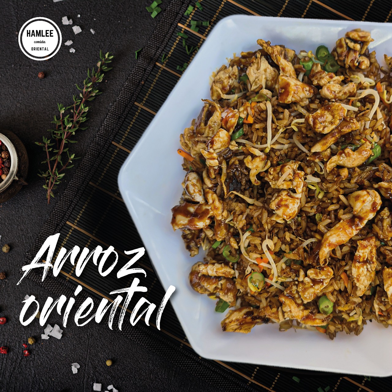 600 g De arroz con trozos de carne, jamón, pollo salteados al wok con vegetales, salsa aparte teriyaki o agridulce.