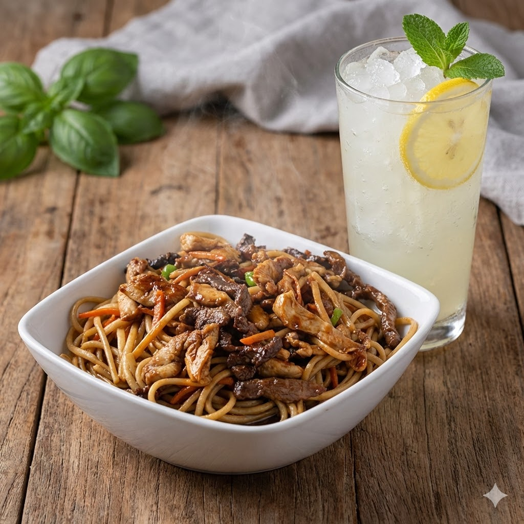 Trocitos de carne y carne Salteados al wok, acompañados con pastas, en salsa teriyaki o Agridulce y Bebida de la casa.
