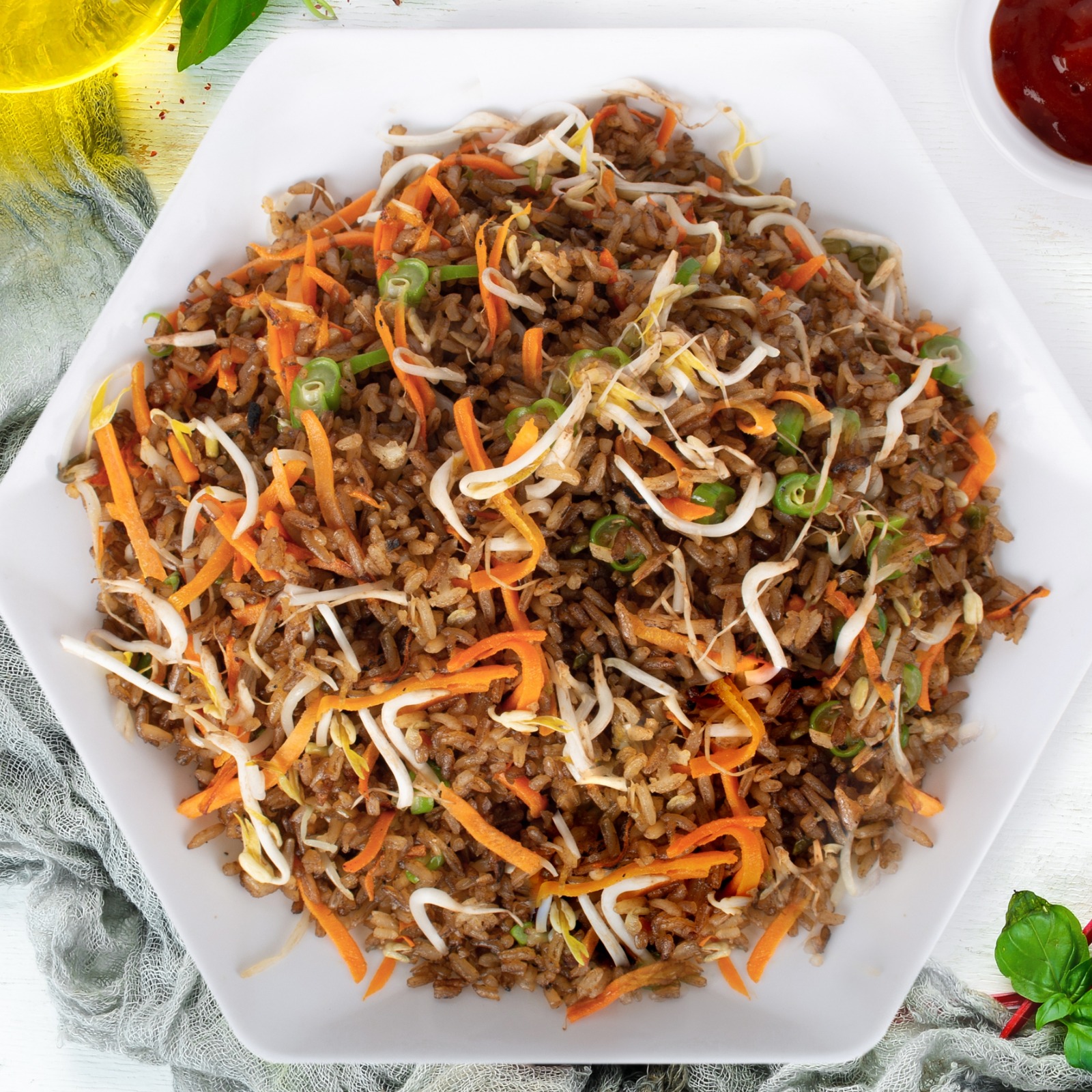 Trocitos de habichuela, zanahoria y raices chinas salteados al wok en salsa teriyaki acompañados.