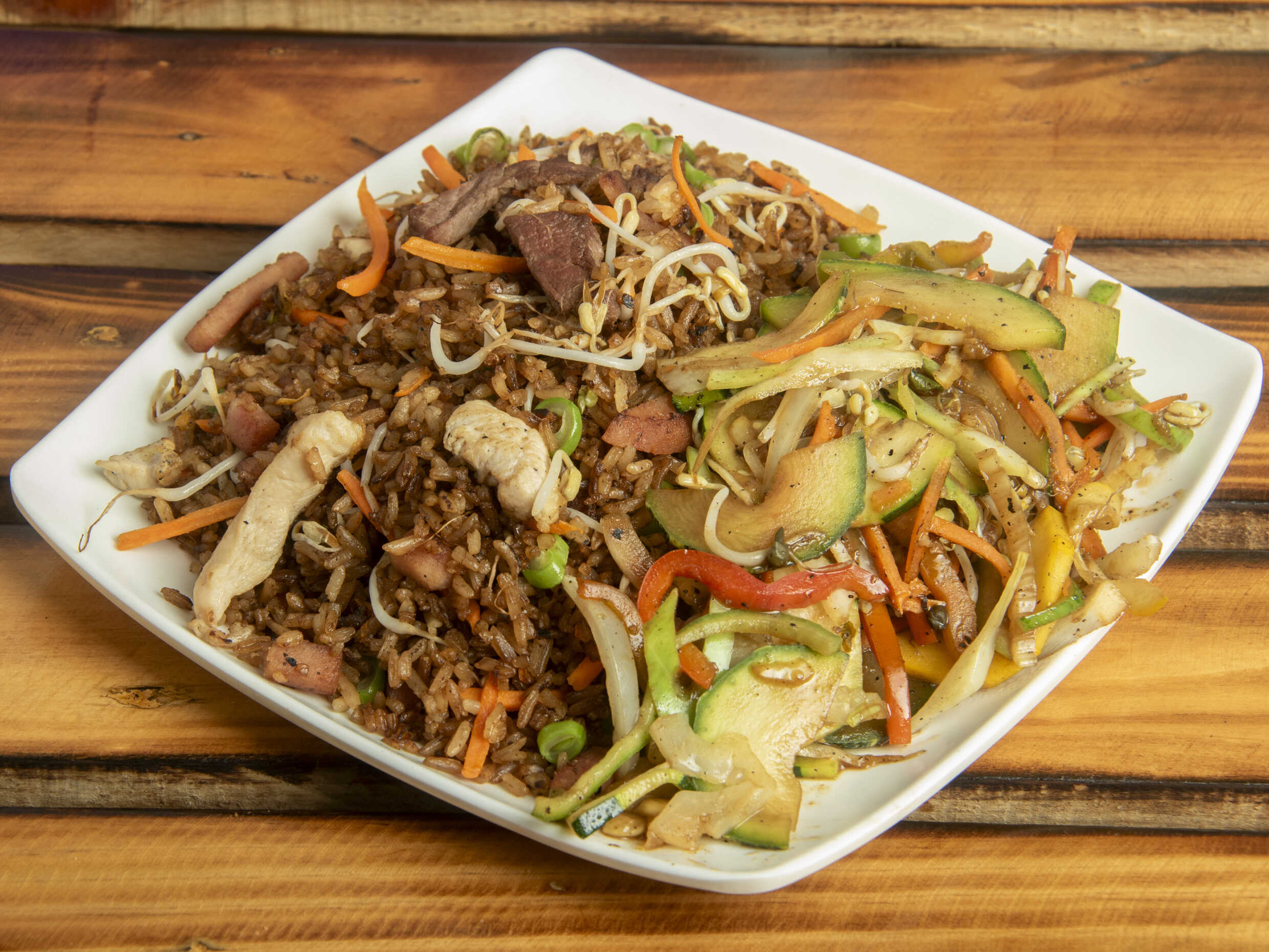 400 g De arroz, trozos de carne, jamón, pollo salteados al wok con vegetales, salsa aparte teriyaki o agridulce.