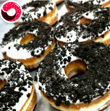 Donut cubierta de fino chocolate negro y rebosada de galleta de oreo.