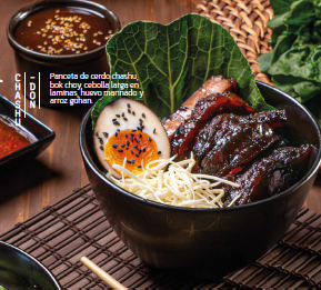 Panceta de cerdo chashu, bok choy, cebolla larga en laminas, huevo marinado y arroz gohan.
