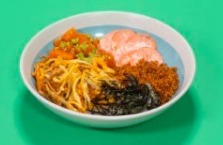 Palmitos desmechados con masago y aderezo de la casa, aguacate, cebollín, cubierto de masago.