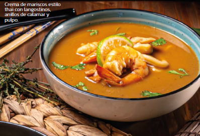 Crema de mariscos estilo thai con langostinos, anillos de calamar y pulpo, acompañada con arroz gohan.