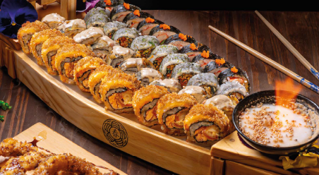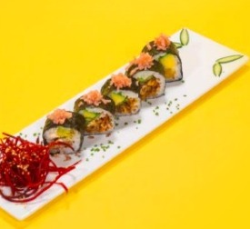 Filete de pechuga rebosada con especias orientales, queso crema aguacate y kakiage (verduras tempura), topping de plátano maduro y langostinos rebosados con salsa fuji y teriyaki.