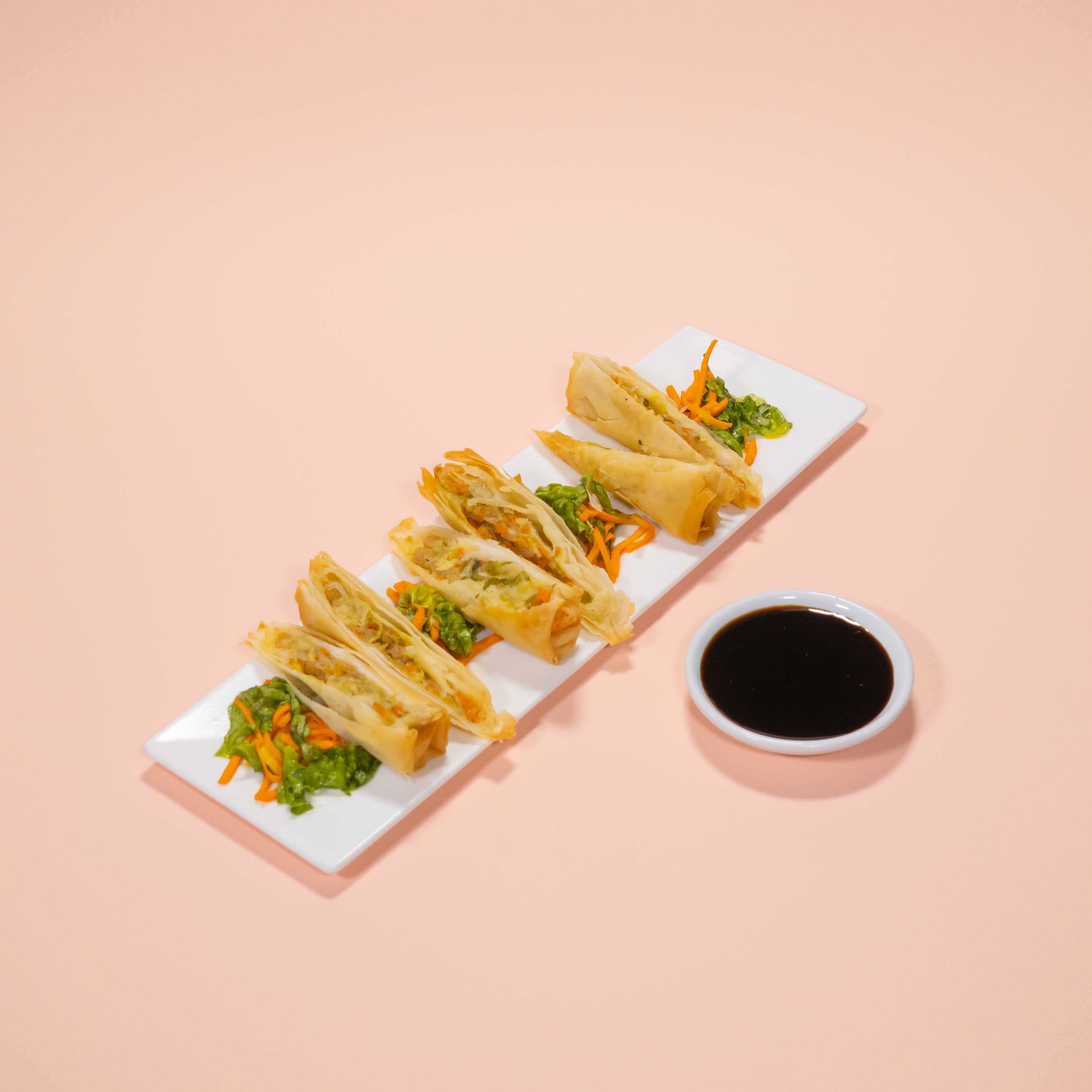 "Rollitos crocantes rellenos de vegetales salteados (3 unidades)."