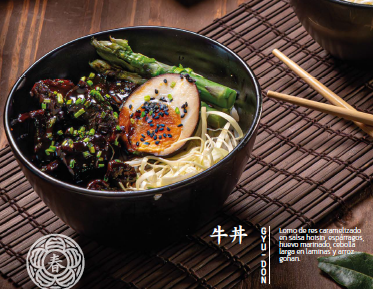 Lomo de res caramelizado en salsa hoisin, espárragos, huevo marinado, cebolla larga en laminas y arroz gohan.