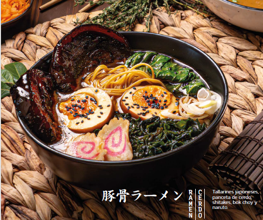 Tallarines japoneses, panceta de cerdo, shitakes, bok choy y naruto.