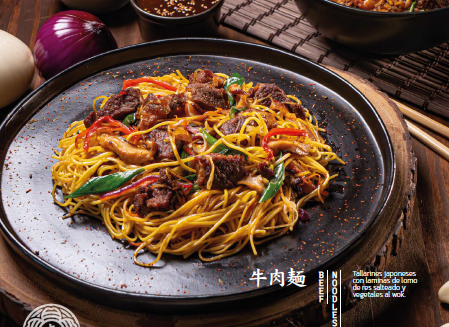 Tallarines japoneses con laminas de lomo de res salteado y vegetales al wok.
