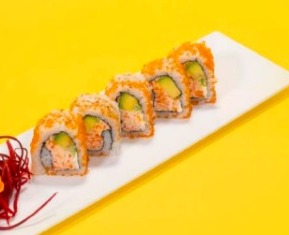 Palmito Kanikama, pepino, aguacate, queso crema. Cubierto de masago y sésamo.