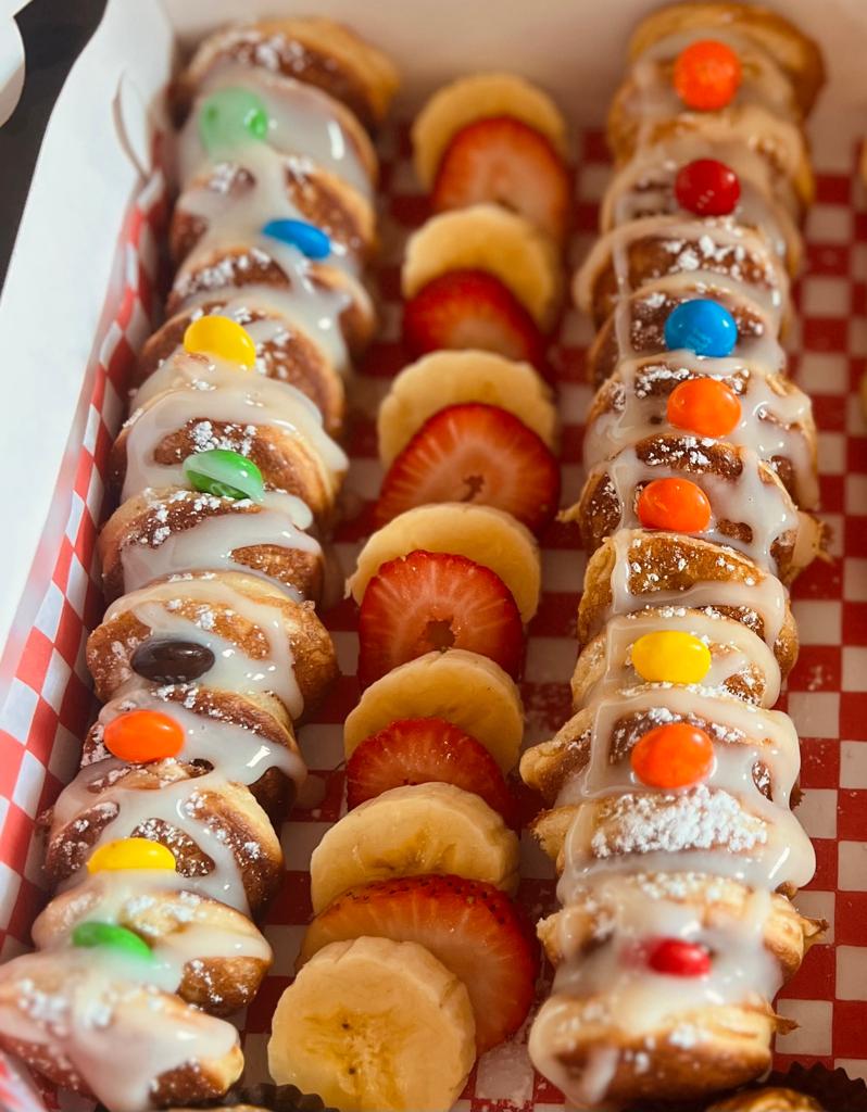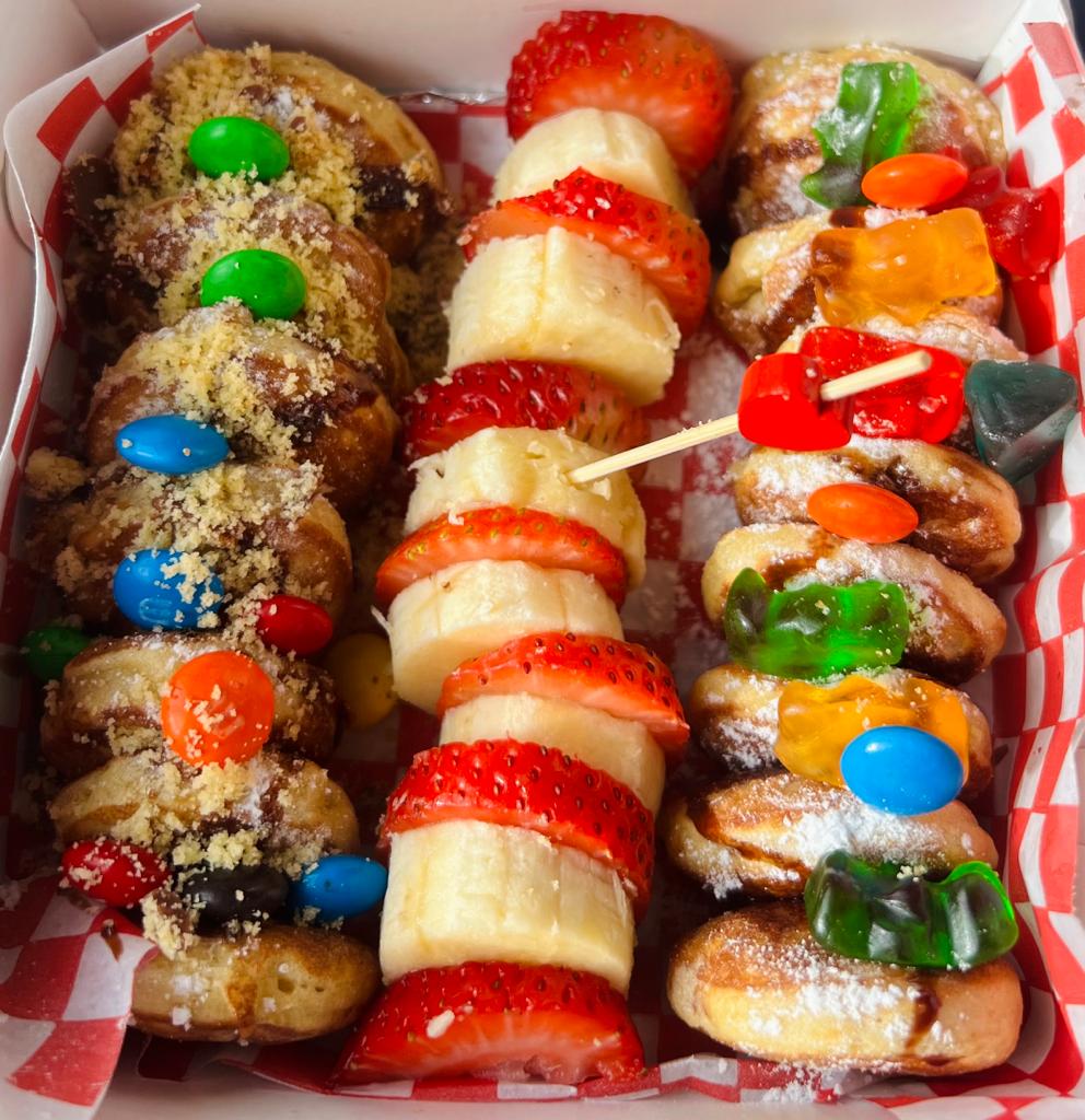 Mini pancakes con 3 toppings a elección y azúcar pulverizada, también le puedes adicionar más toppings por un costo adicional de 2.500.