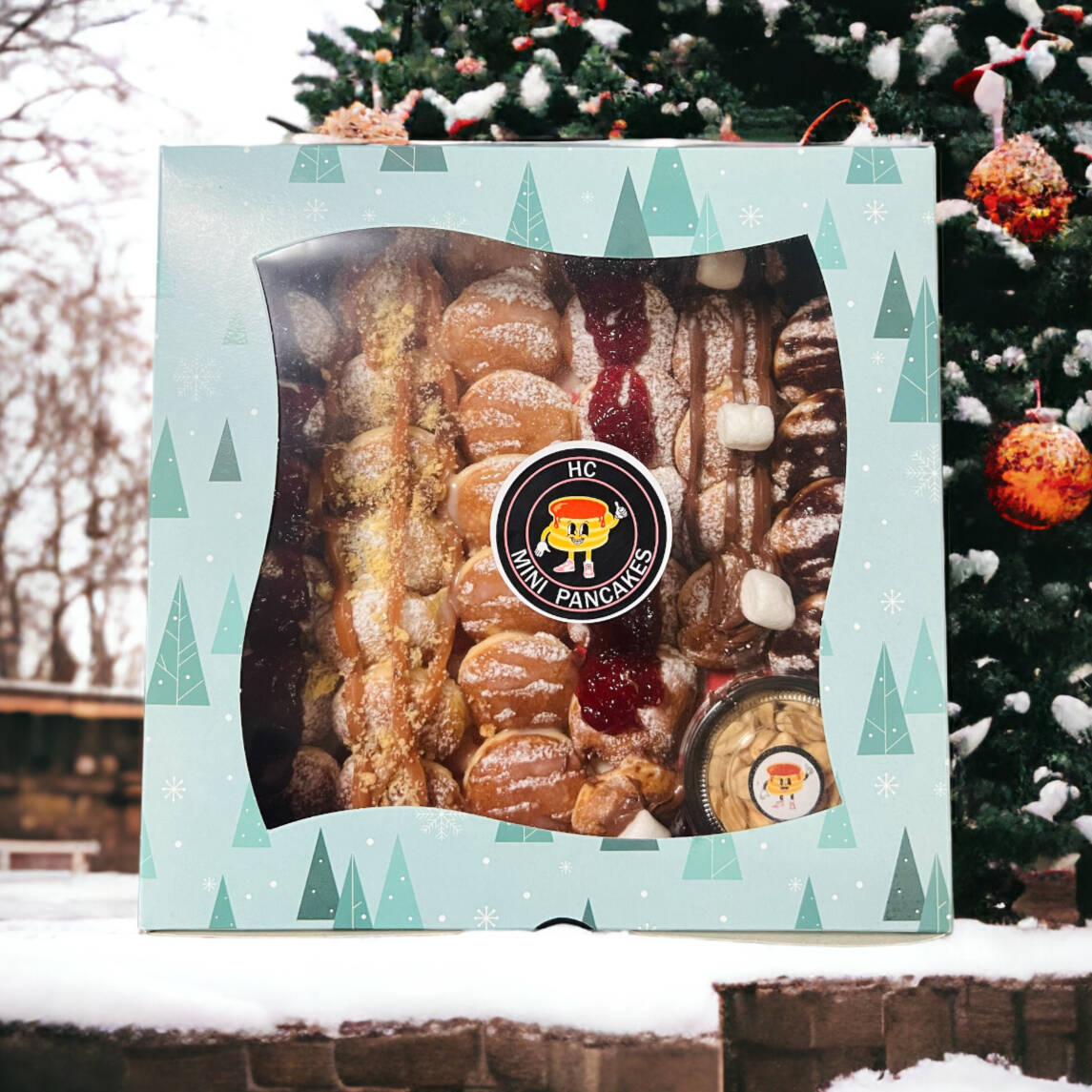 Disfruta 30 mini pancakes esponjosos con 3 toppings a elección, presentados en una hermosa caja temática de Navidad. Perfecta para compartir y endulzar cualquier momento festivo. ✨
