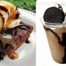 Para 1 : brownie de chocolate - 2 bolas de helado - salsas - 1 topping como : grageas - coco - mani - milo - leche en polvo